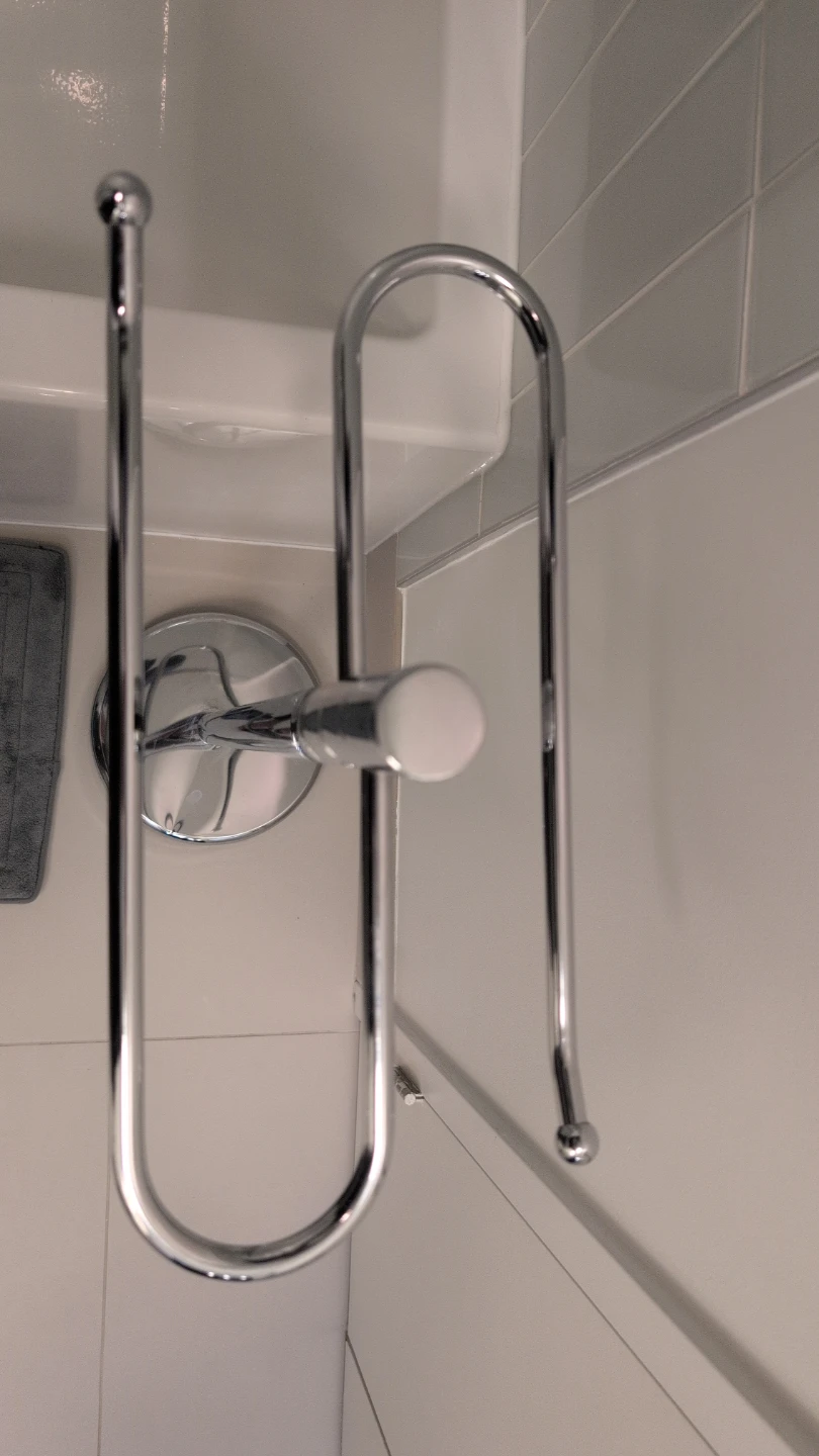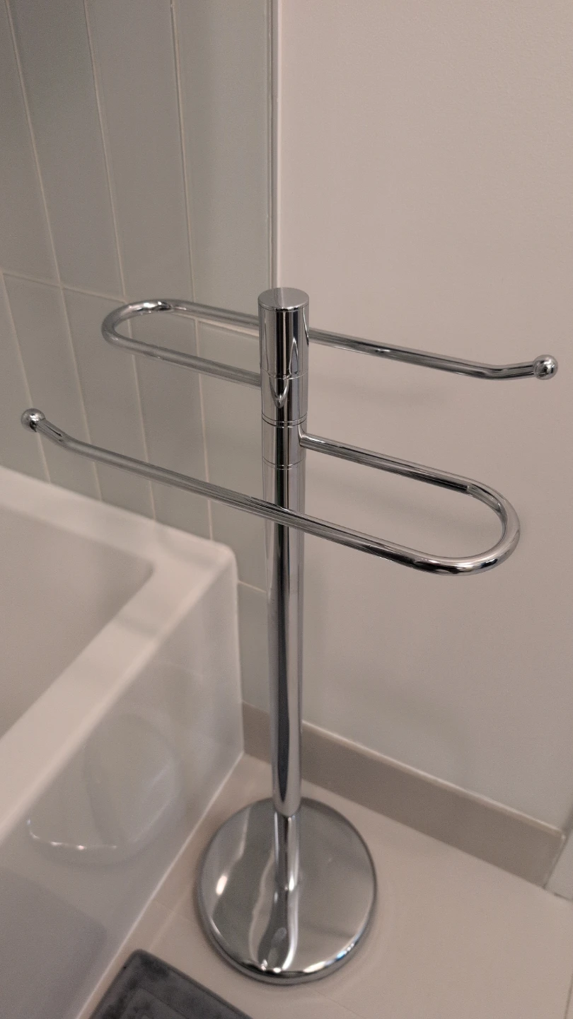 Here's a chrome towel rack stand in great condition! (Just a couple small cosmetic dings on the base). It has a weighted base and the racks can rotate. It's perfect for keeping your towels organized and adding a touch of modern style to your bathroom.