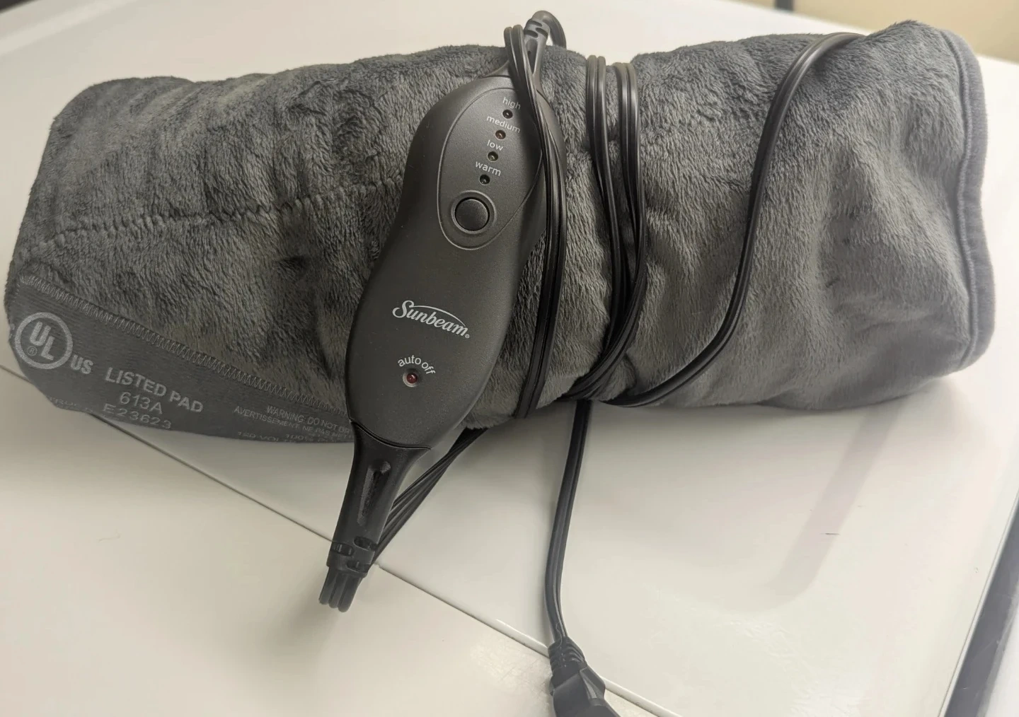 Here's a Sunbeam heated pad in grey! It's in great shape and ready to keep you warm on those chilly nights. Perfect for adding a little extra comfort to your bed or couch