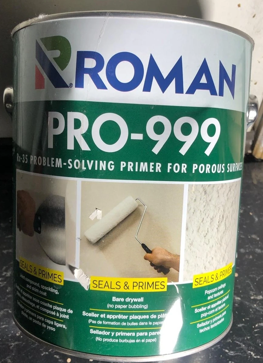 Selling a can of Roman PRO-999 primer! It's designed as a problem-solving primer for porous surfaces. Great for sealing and priming joint compound, spackling, and skim coats. Also works well on bare drywall and popcorn ceilings and textures.