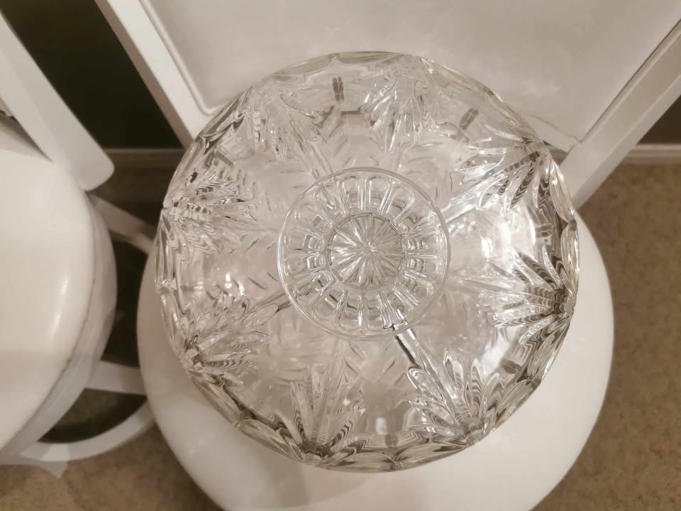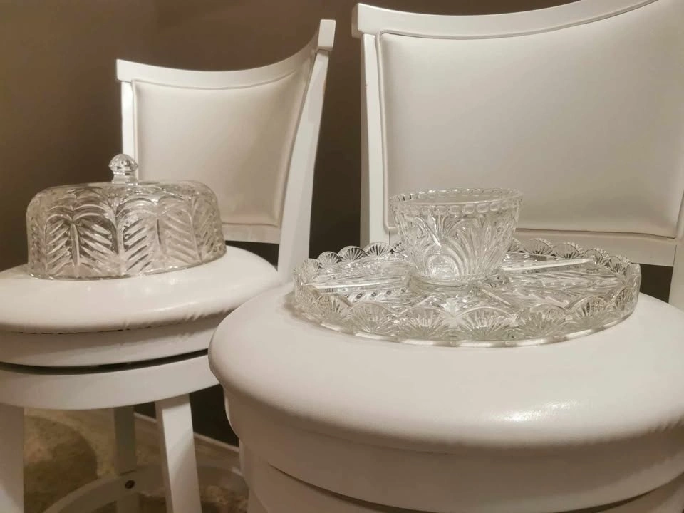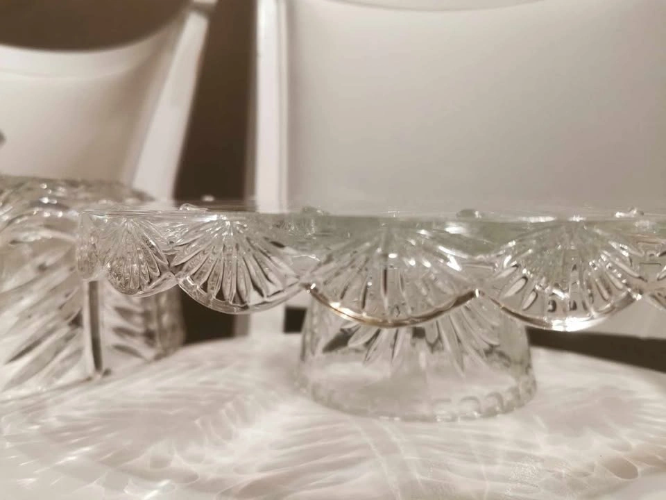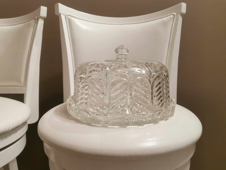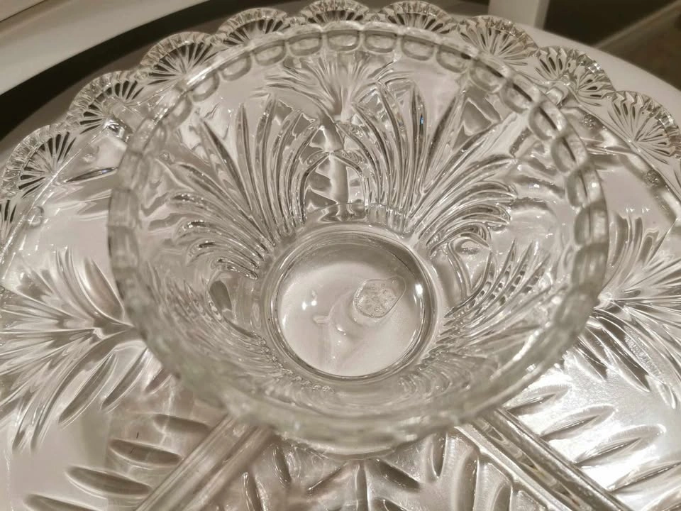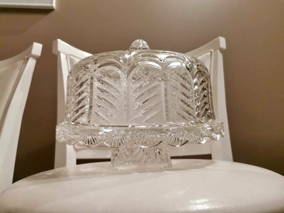 - Heavy glass cake plate stand reversible to use as chip and dip tray, and dome lid cover.