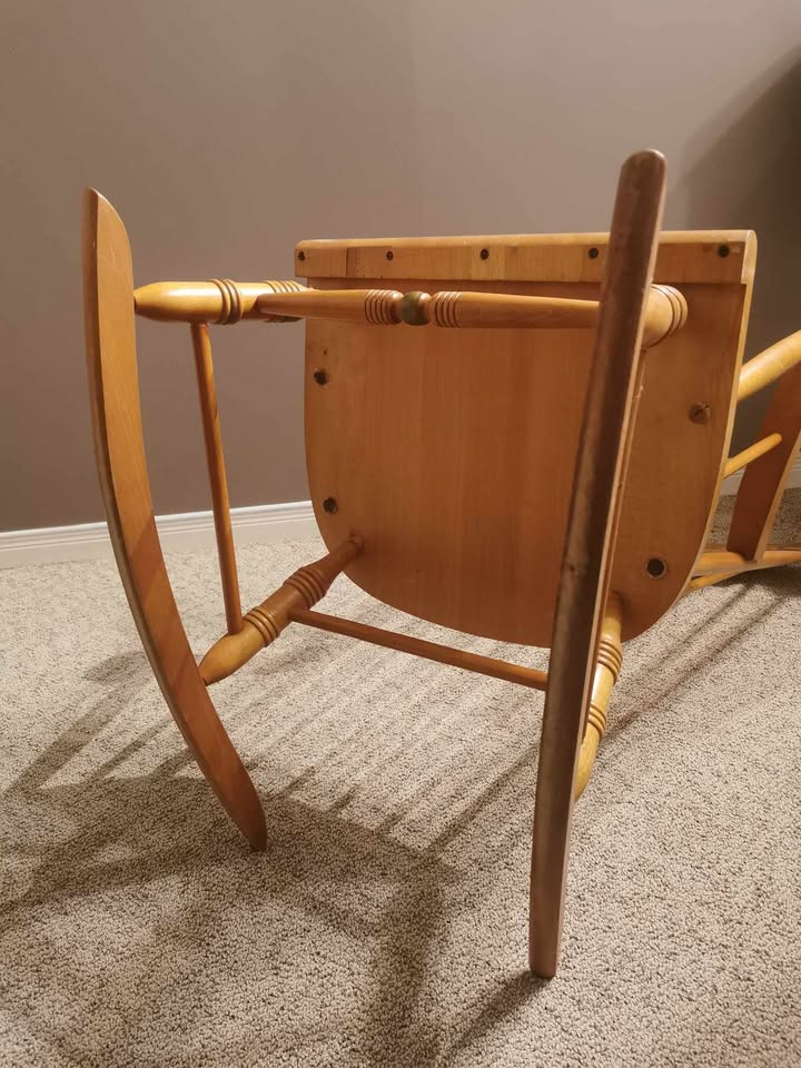 Rocking chair in good condition. Scratches mostly in seat area as shown in photos. Sturdy, but bit of creaking, so could use further reinforcement.