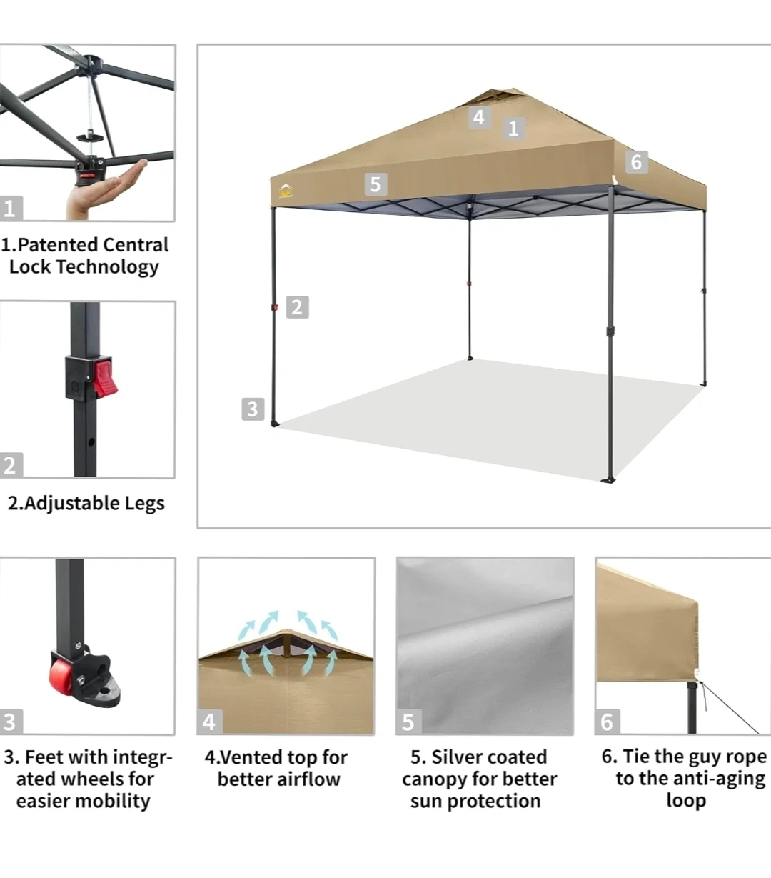 It features patented central lock technology and adjustable legs for easy setup and stability.