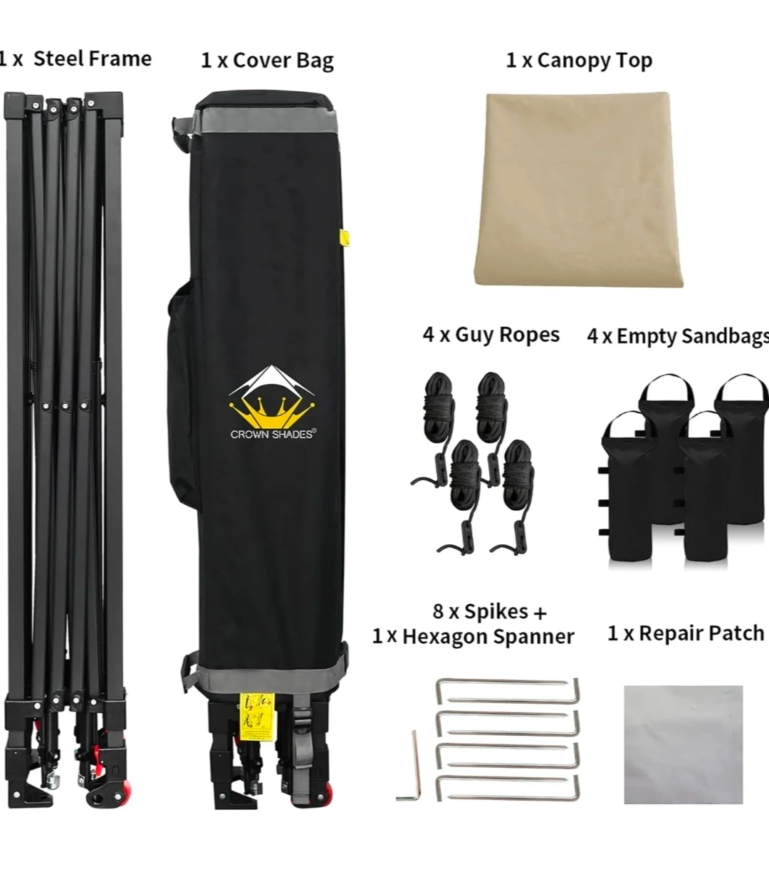 Included are guy ropes, empty sandbags, spikes, a hexagon spanner, and a repair patch.