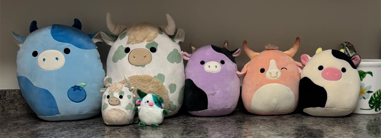All as is, they have been sitting on a shelf, not played with as toys, not collecting cows anymore & these are the last ones of my collection First picture shows sizes Have the cards for them also Second, Blueberry 12 inches $20.00 Third, Large green 12 inches $20.00 Small green 5 1/2 inches $5.00 Fourth, Purple 9 1/2 inches $15.00 Fifth, Orange 8 1/2 inches $15.00 Sixth, B&W 8 1/2 inches $15.00 Seventh, Green with clip 4 inches $5.00, not a Squishmallow Last has info Available 11-3 for pick up Get them before the rain comes Exact cash only Measurements are rough Other stuffed animals in a different listing