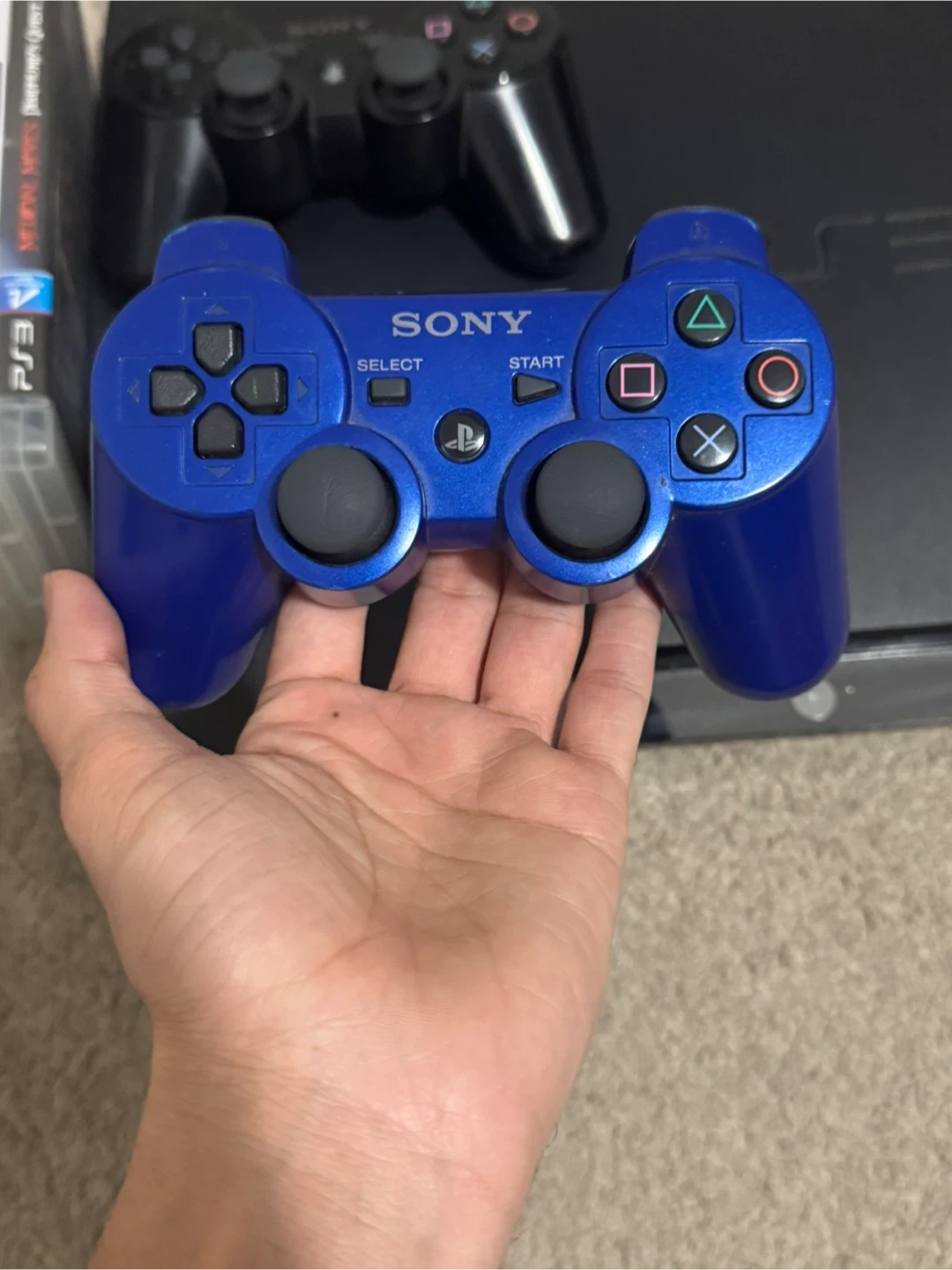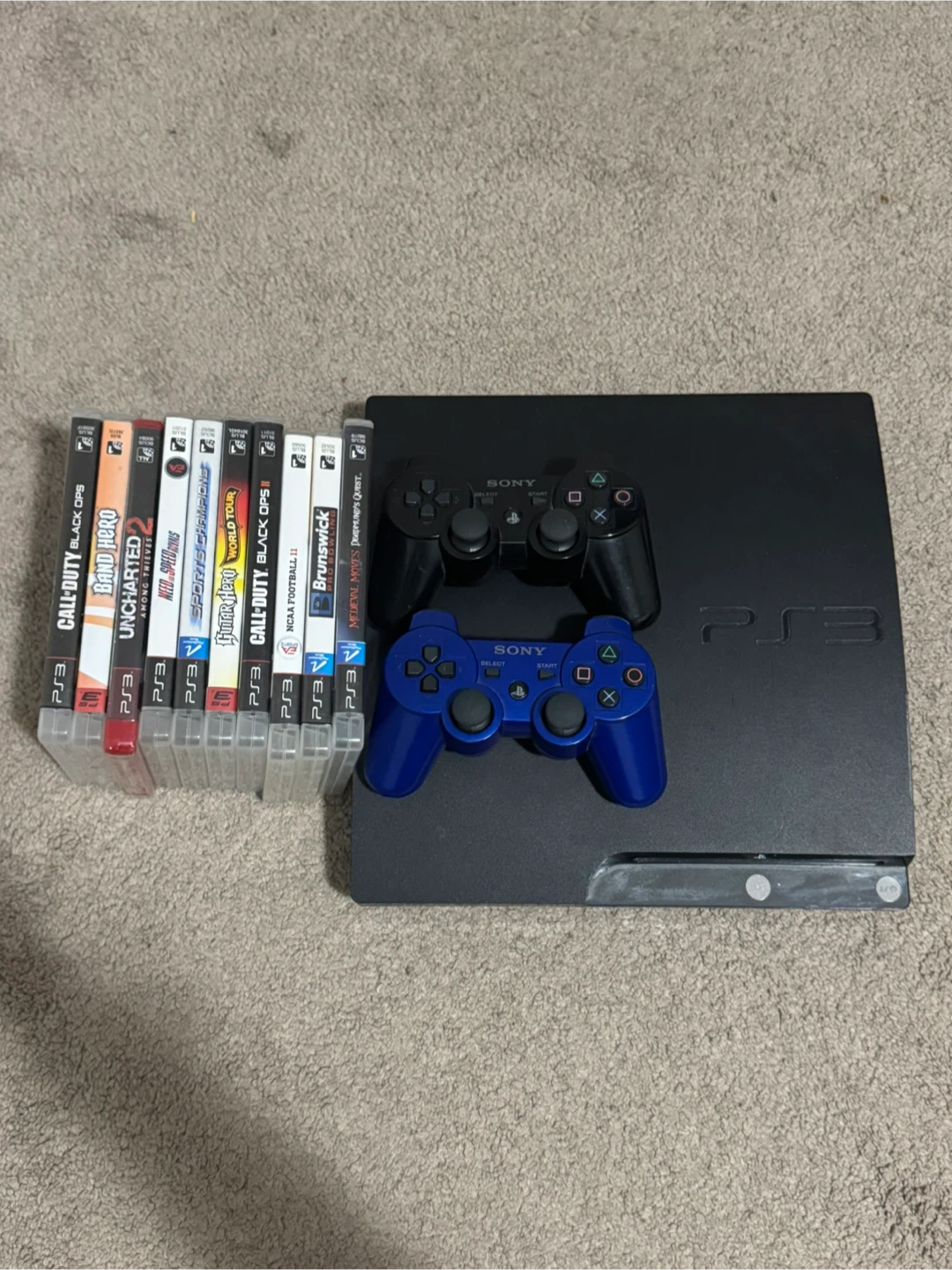 Selling a Sony PlayStation 3 (PS3) console with games and controllers. Includes a mix of games and both a black and a blue controller. Great for anyone looking to relive some classic gaming!