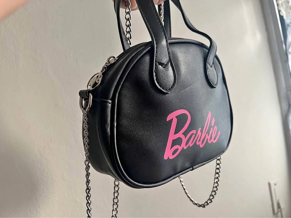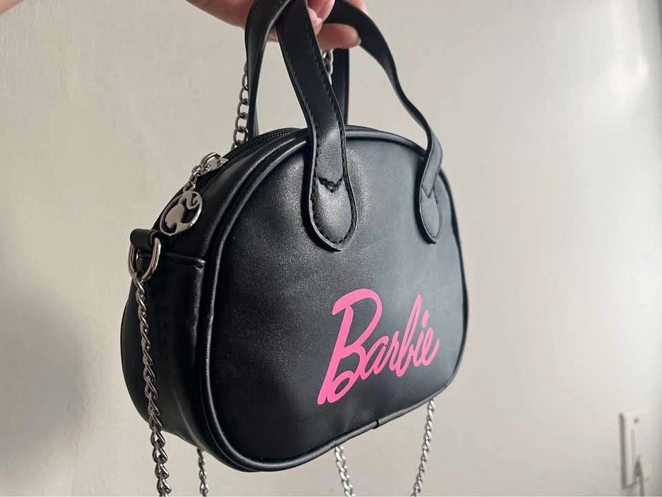 Trendy and super cute minisou black Barbie handbag with a pink logo and shiny silver chain strap. Perfect for adding a little pop to any outfit! Compact but roomy enough for your essentials.