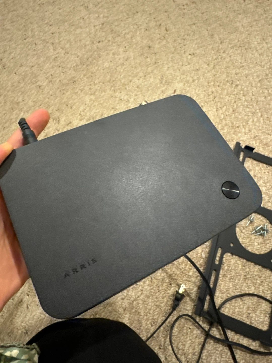 This is an Arris router or modem. It's dark gray and comes with a power cord. Mounting bracket and screws are also included.
