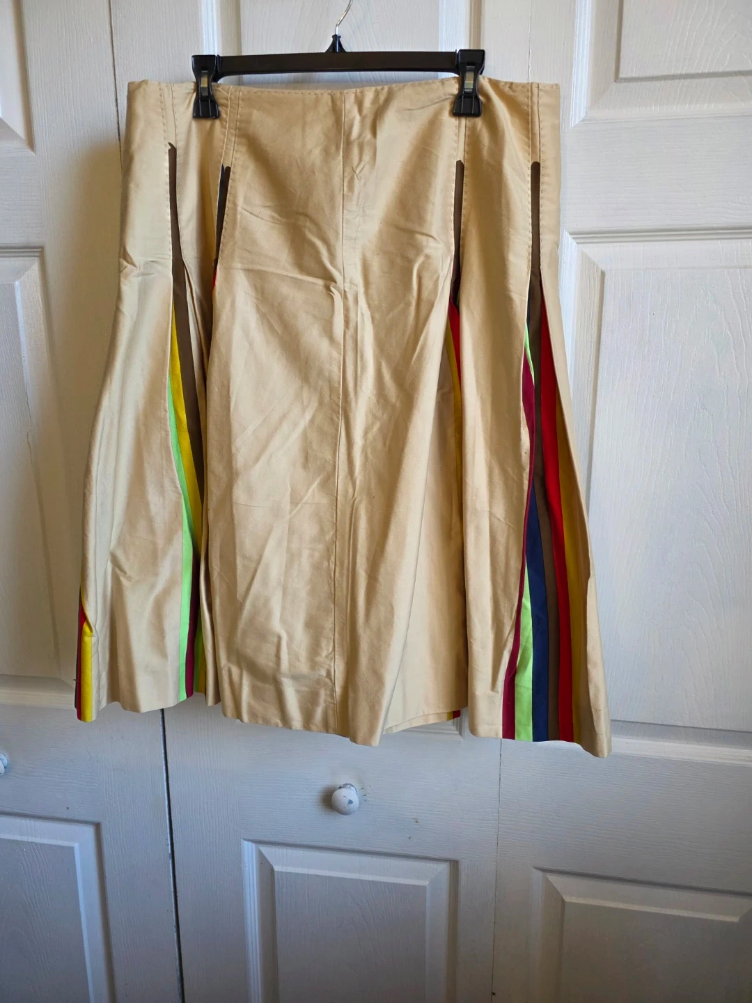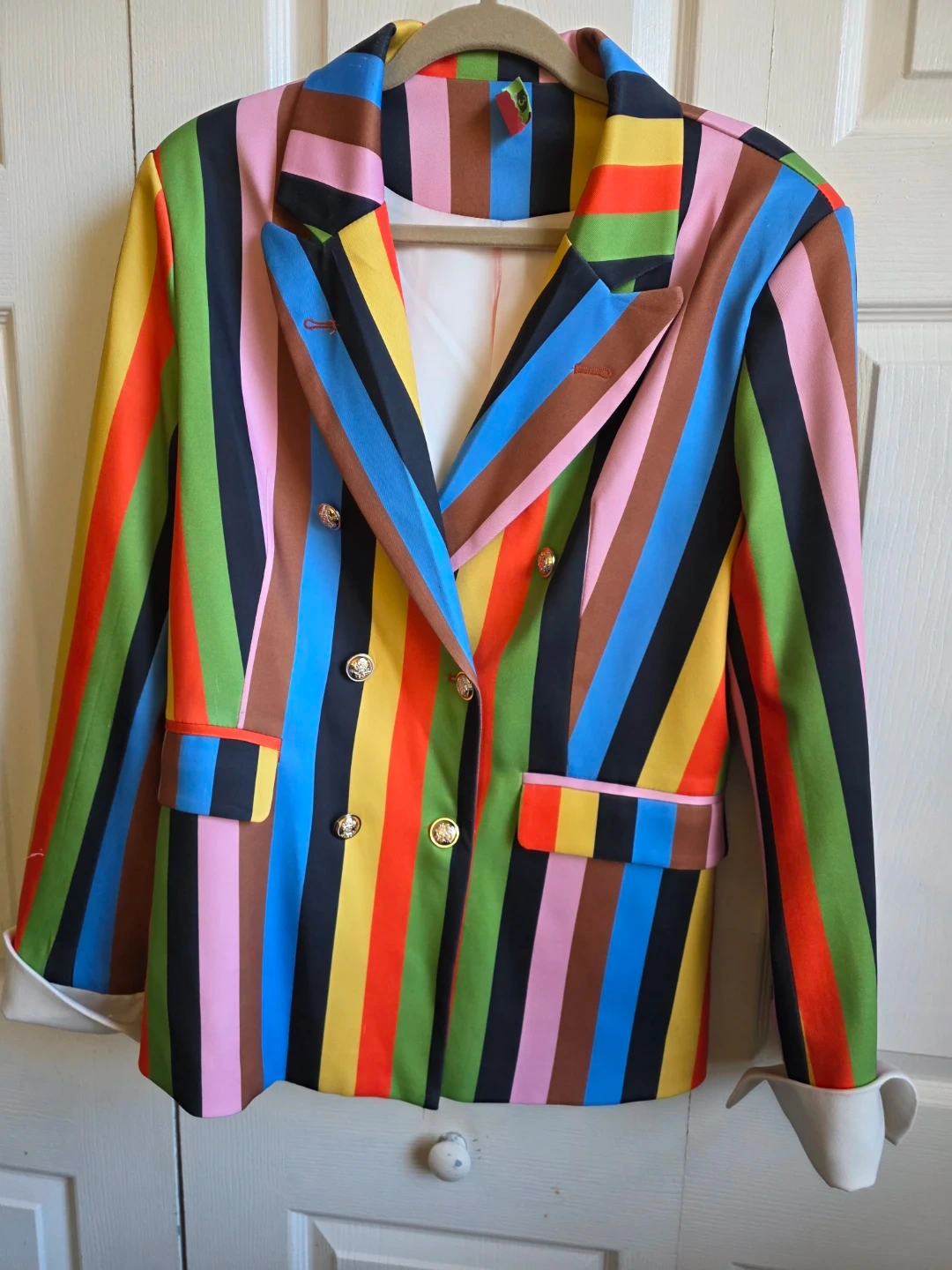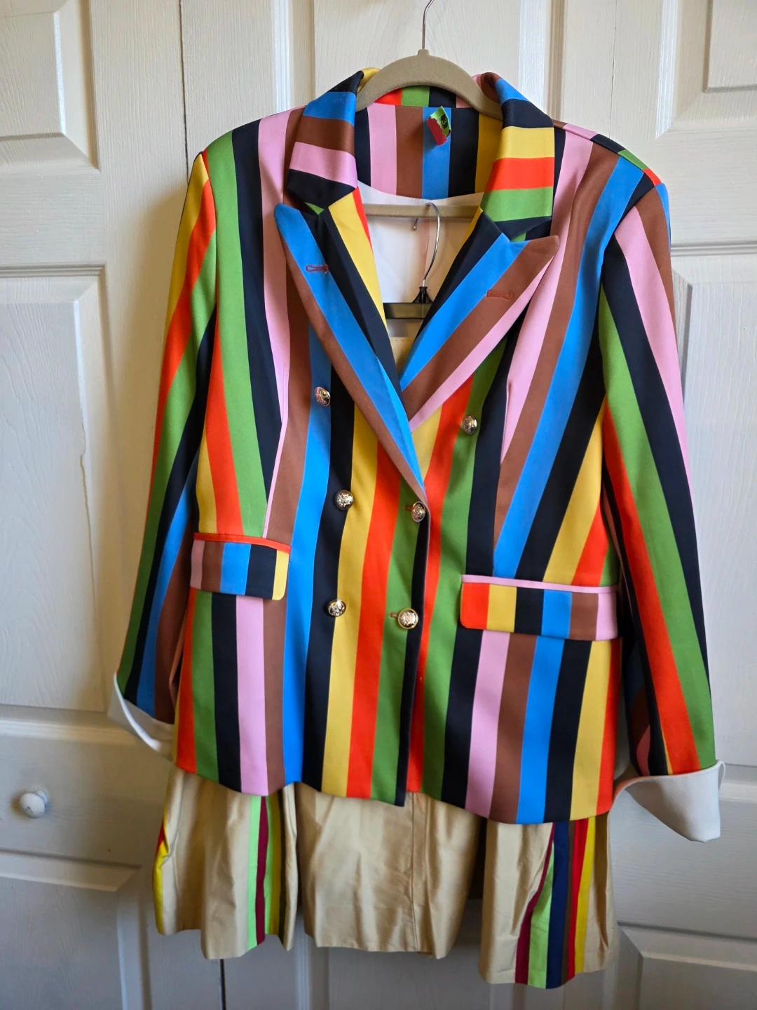 Stylish blazer and skirt set with vibrant vertical stripes. Blazer features a double-breasted design with gold-tone buttons. Skirt is a neutral tan with accent stripes. Great for a bold fashion statement!