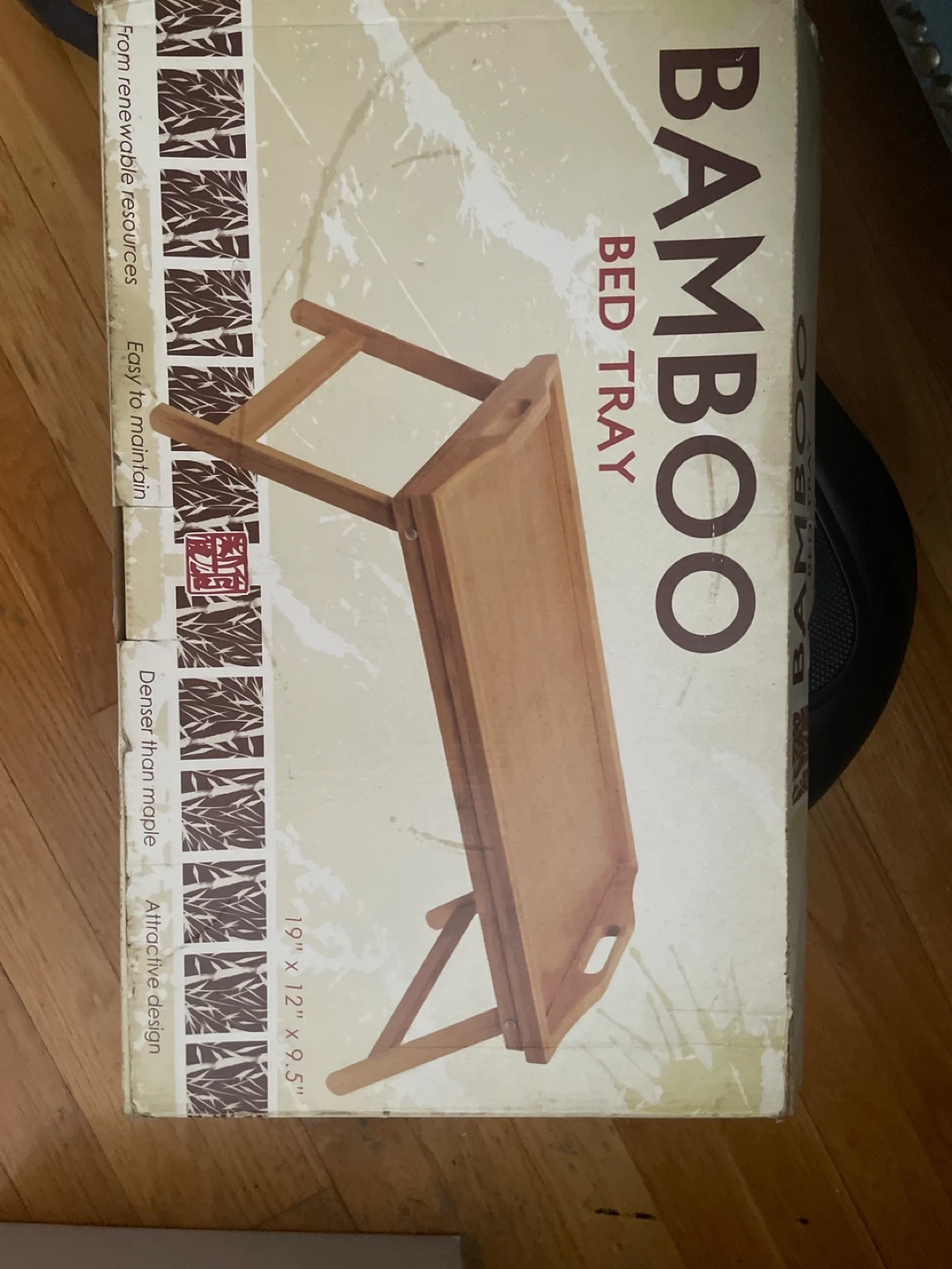 Selling a Bamboo bed tray! It's 19" x 12" x 9.5". It's made from renewable resources and is easy to maintain. It's also denser than maple and has an attractive design