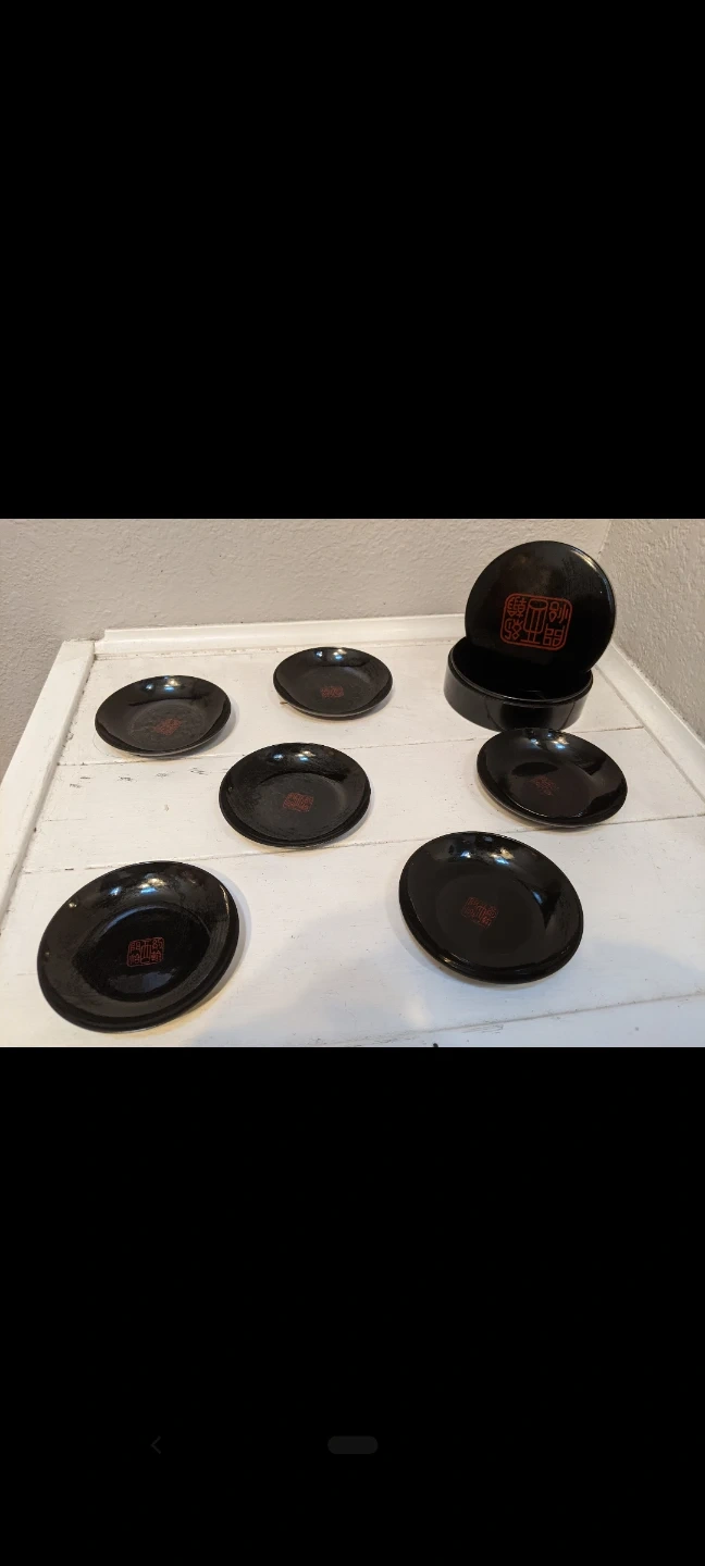 Here's a set of six black lacquerware coasters! They come with a matching lidded box for storage.