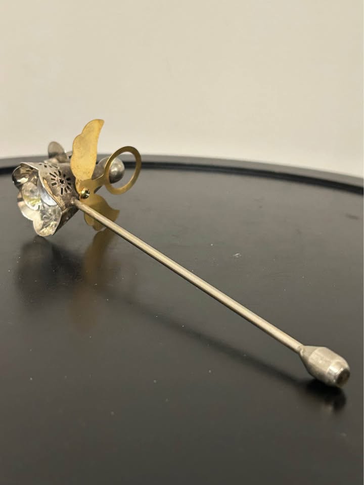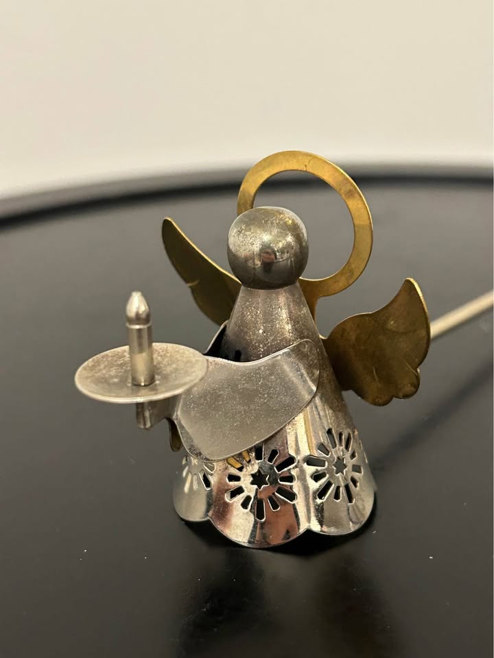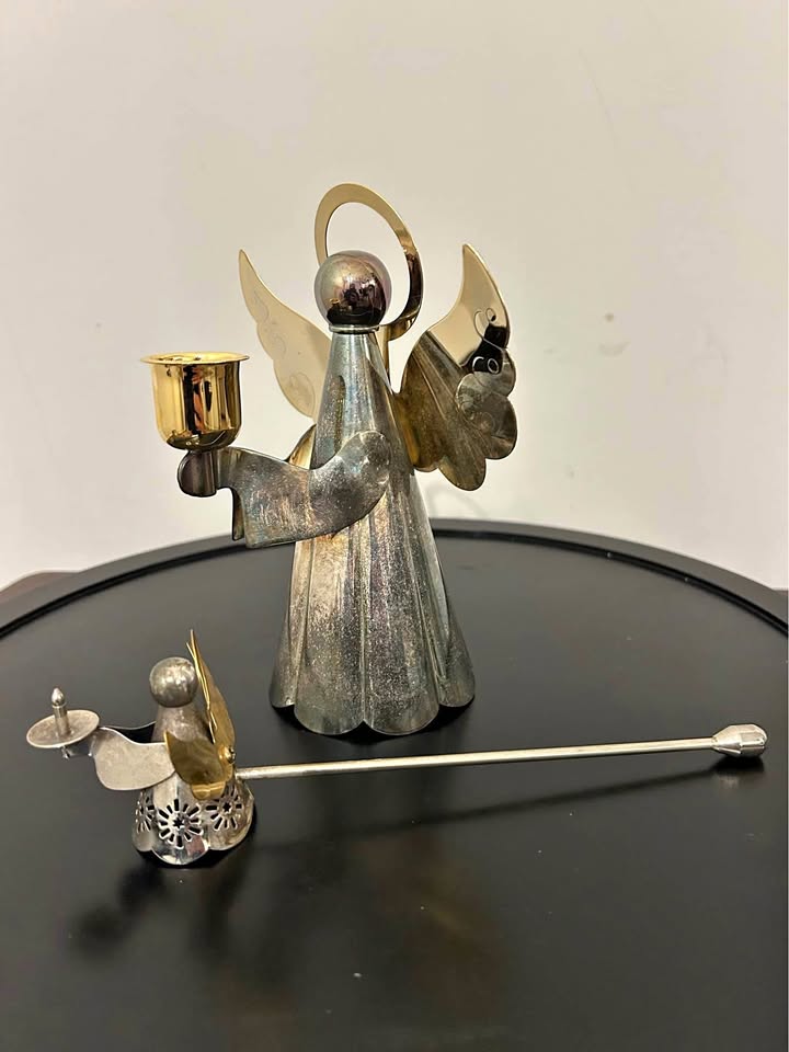 Beautiful vintage angel candle holder and matching candle snuffer set, crafted in silver-tone metal with brass details. The larger angel holds a candle cup with golden wings and halo, while the smaller angel snuffer features delicate cutout details. Perfect for Christmas decor, Advent displays, or as an elegant spiritual accent piece.