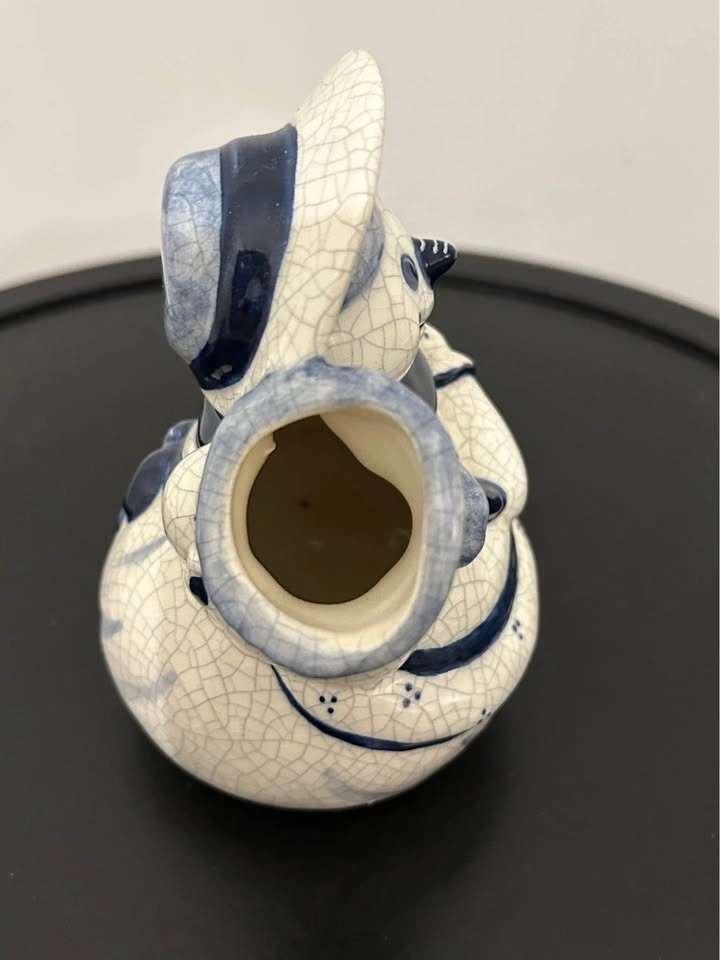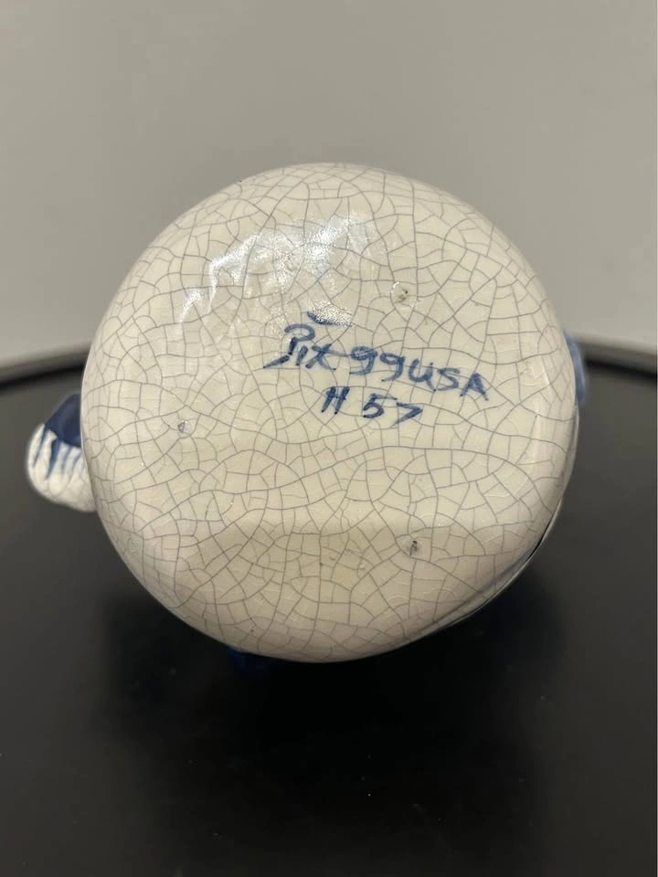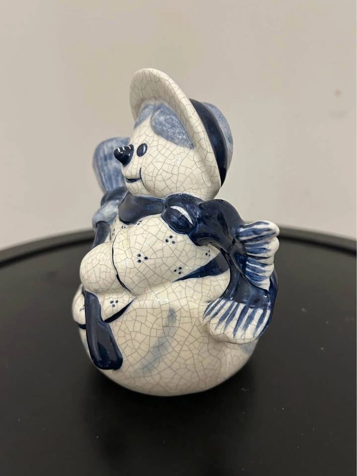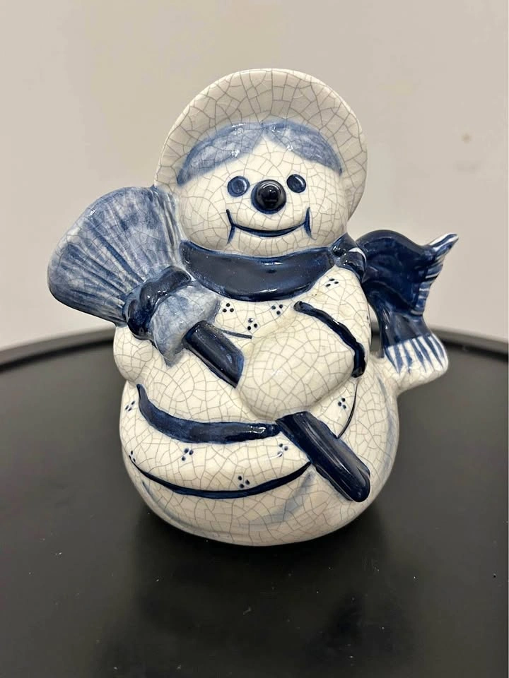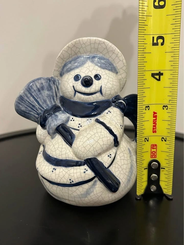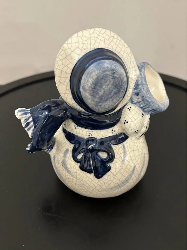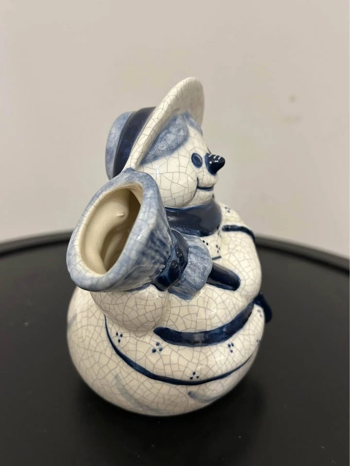 Charming blue and white ceramic snowman creamer by Dedham Pottery – The Potting Shed. Features a crackle glaze finish and hand-painted details in classic Dedham blue. The cheerful snowman holds a broom and wears a scarf and hat — a delightful collectible piece that brings vintage charm to your Christmas decor or holiday table setting.