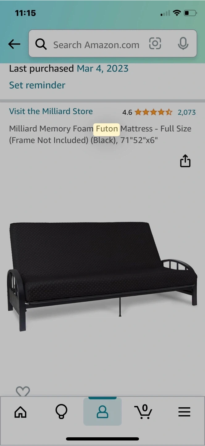 Selling a Milliard Memory Foam Futon Mattress in full size. The color is black and the dimensions are 71" x 52" x 6". Last purchased on March 4, 2023