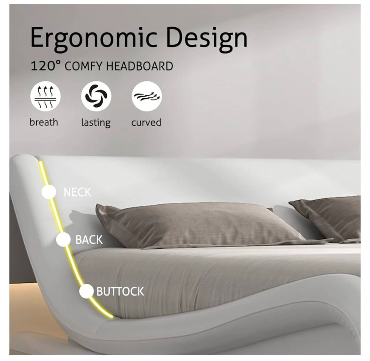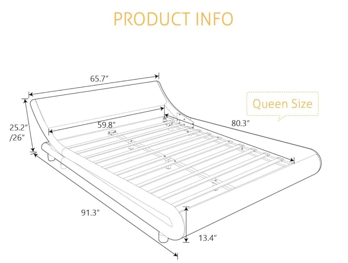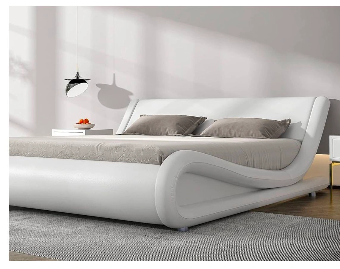 SHA CERLIN Queen Size Bed Frame, luxury wave-like modern upholstered low profile platform bed, faux leather sleigh bed with adjustable headboard. No box spring needed, white.