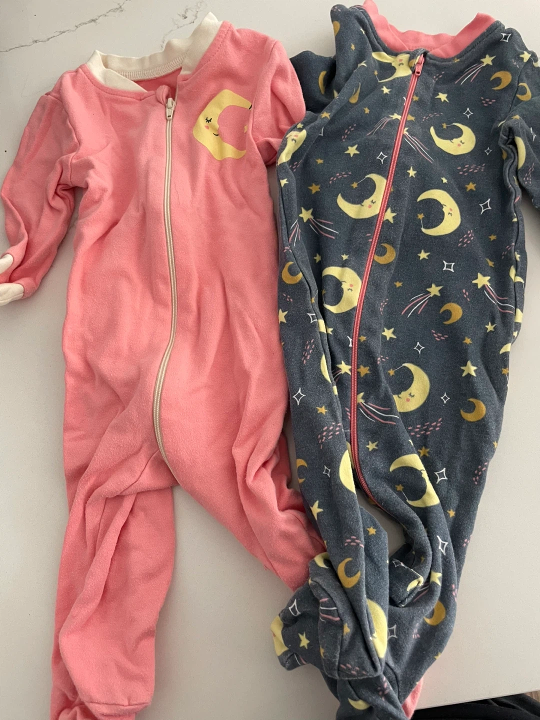 Two adorable baby sleepers up for grabs! One is a soft pink, and the other features a cute moon and stars pattern. Perfect for keeping your little one cozy and comfy during those sleepy nights 3-6 months