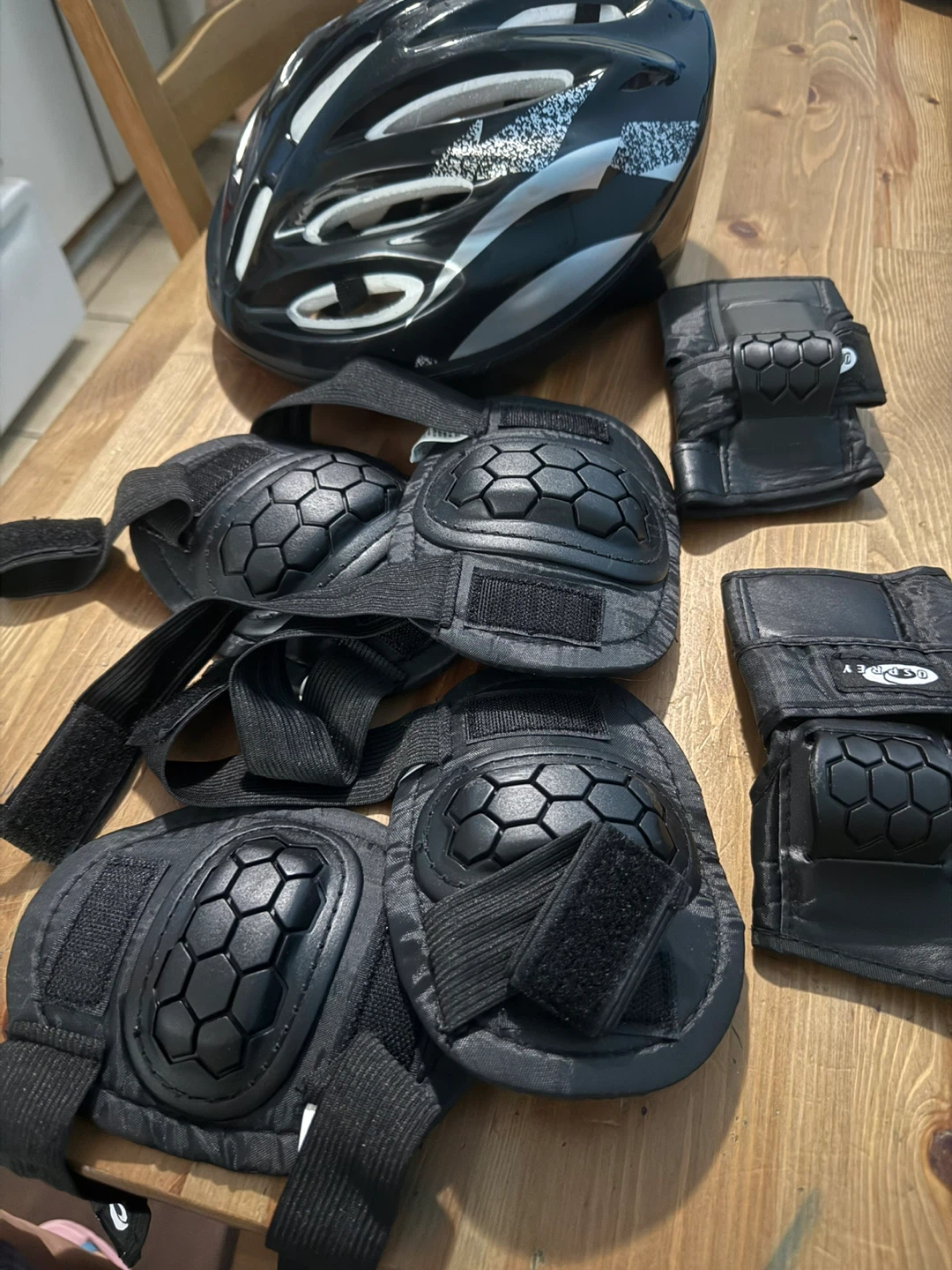 Selling a kids' helmet and protective gear set from Osprey! This set includes a helmet, knee pads, elbow pads, and wrist guards, all in black. Perfect for keeping your little one safe while biking, skateboarding, or rollerblading. Great condition and ready for a new home!