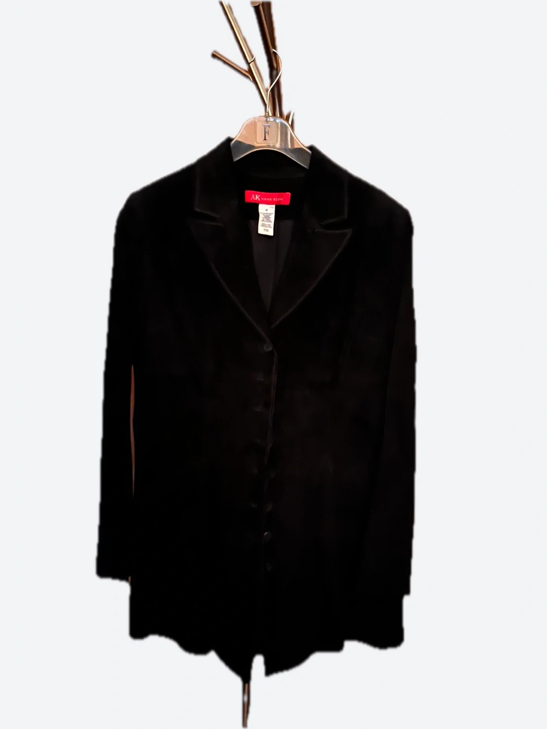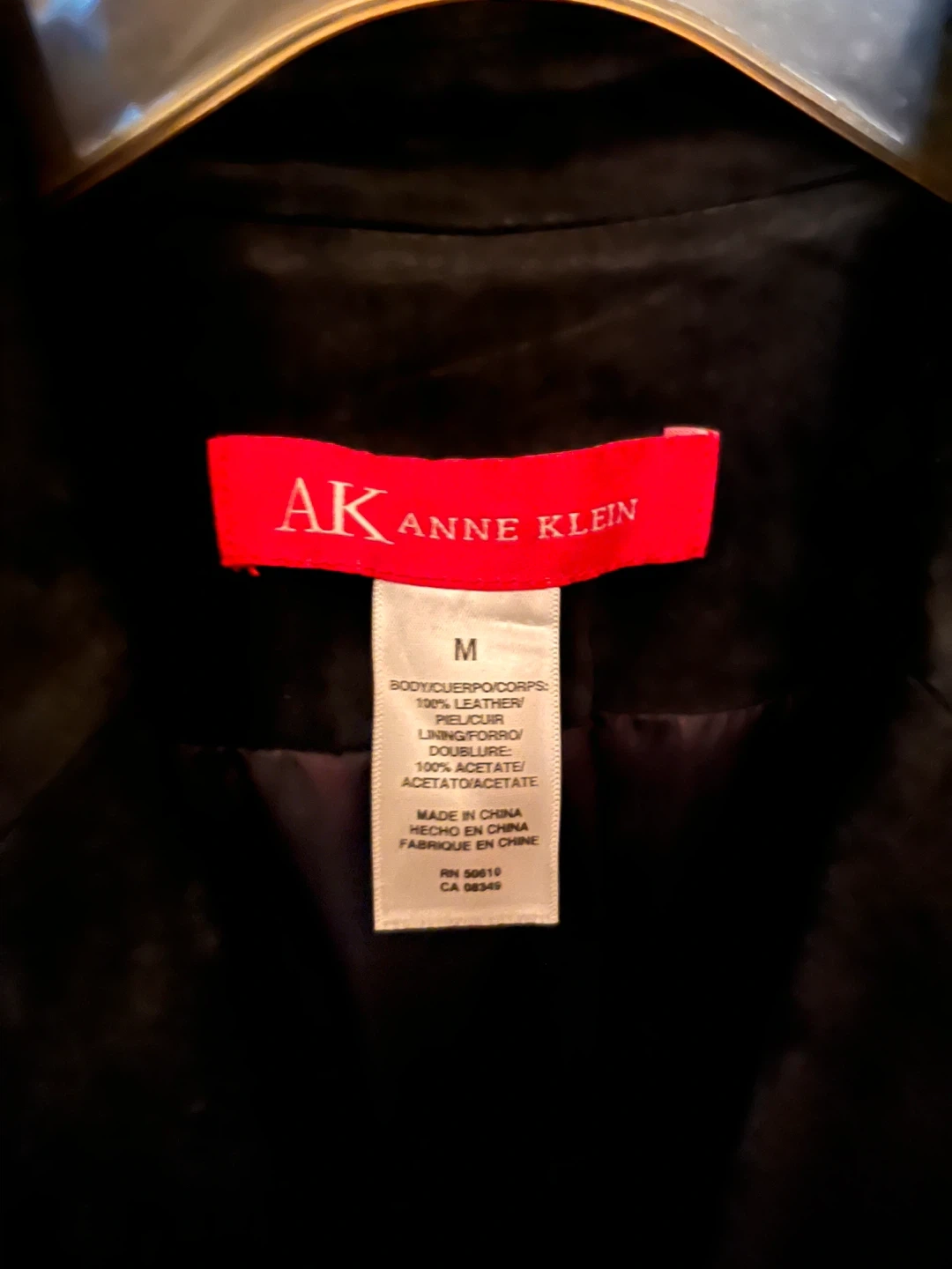 Selling a stylish Anne Klein black leather jacket in size M. It's made of 100% leather for the body and lining, with an acetate/acetate blend for the lining. It has a unique star design on the back!