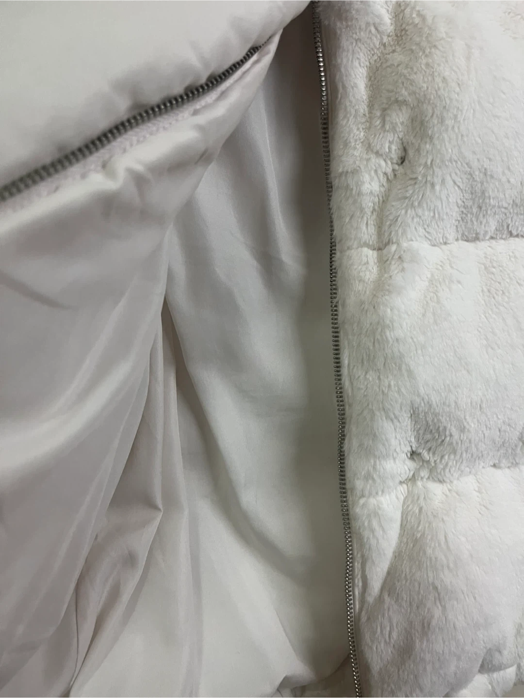 Selling a cozy white faux fur puffer coat.