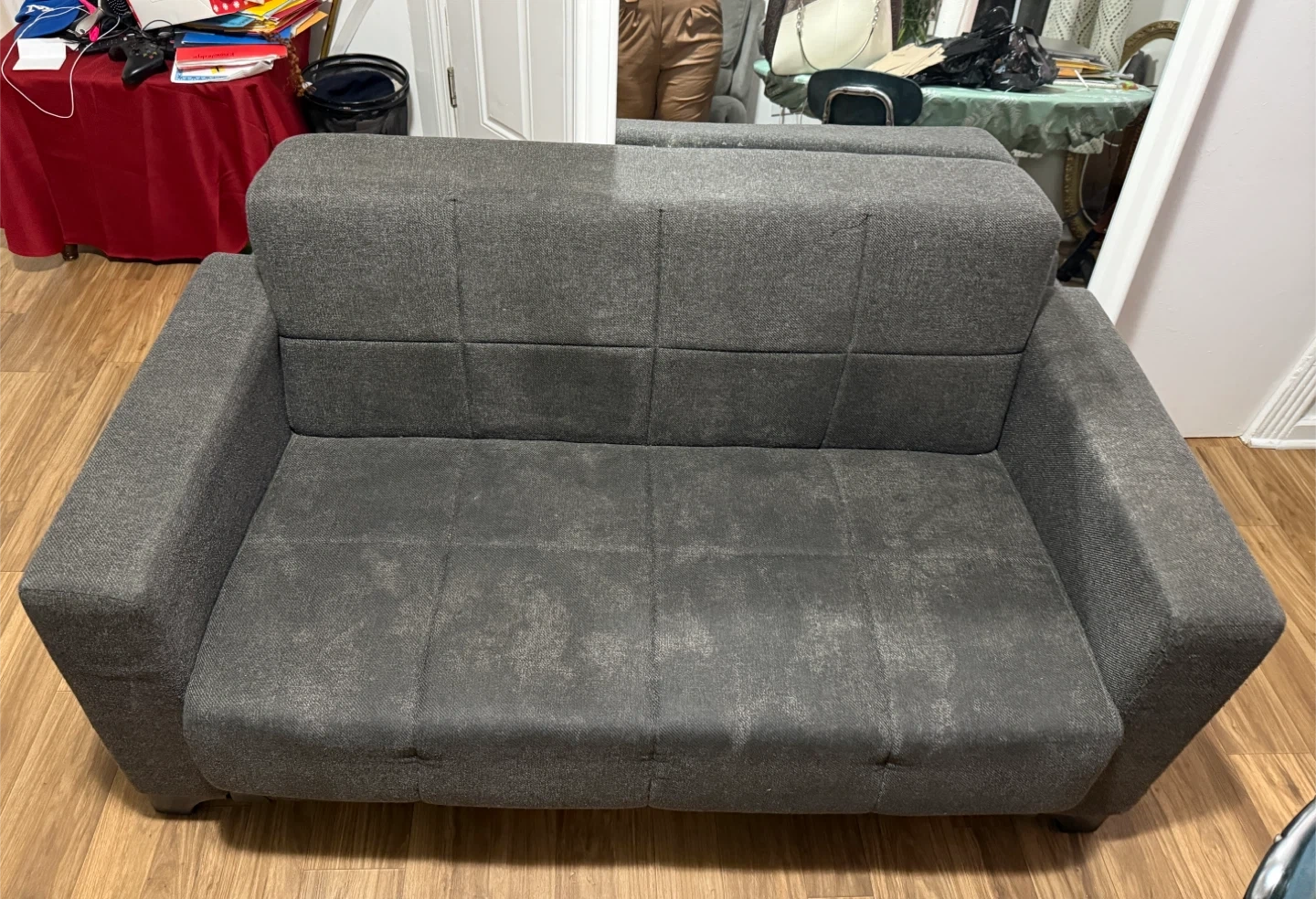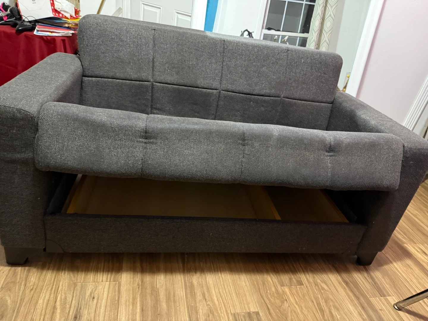 Selling a comfortable gray loveseat sofa. It's in good condition and ready for a new home. Perfect for small spaces or as an addition to your living room. The sofa features a simple design and neutral color that will easily match any decor. It also has a storage space underneath the seat.