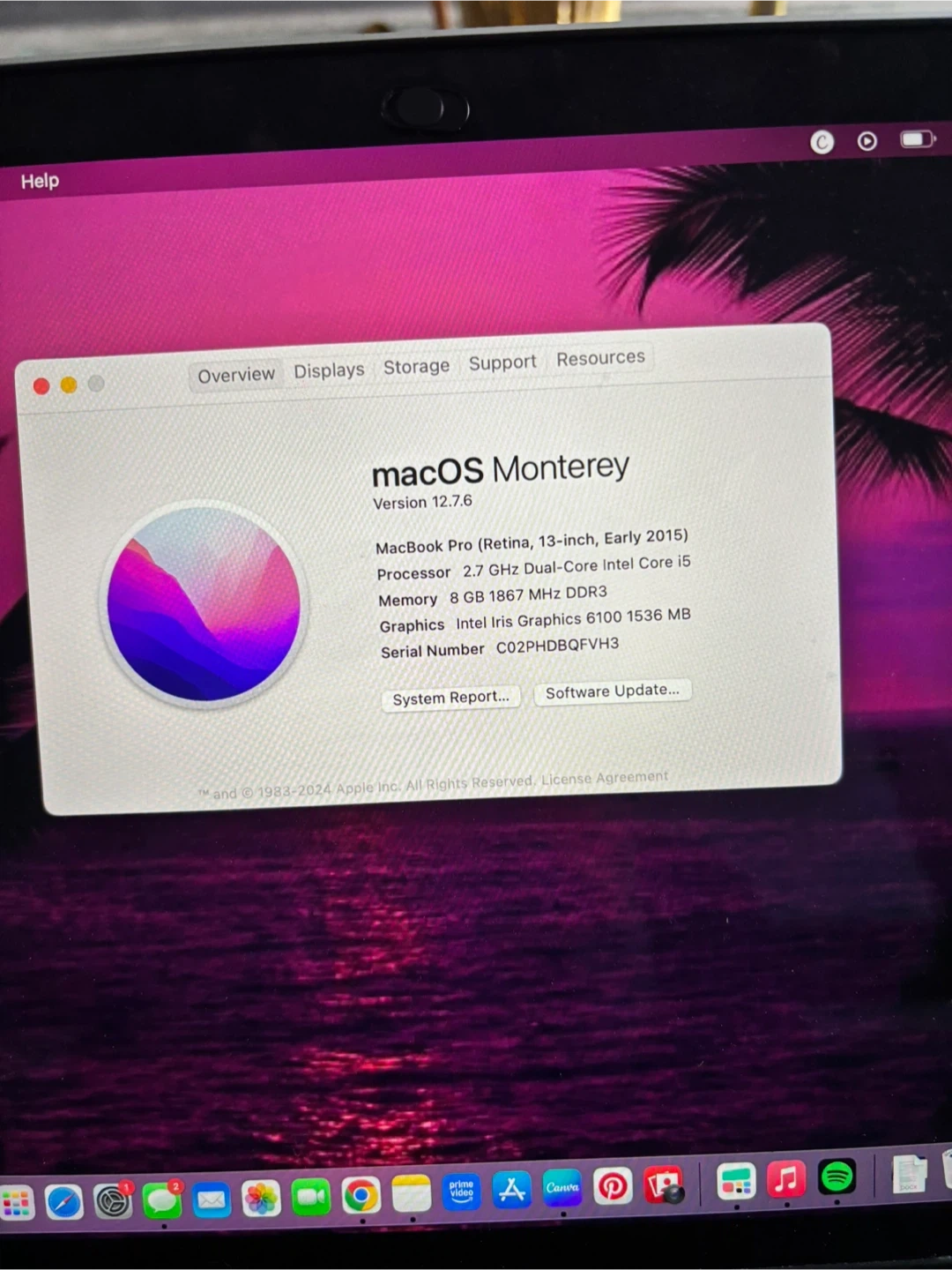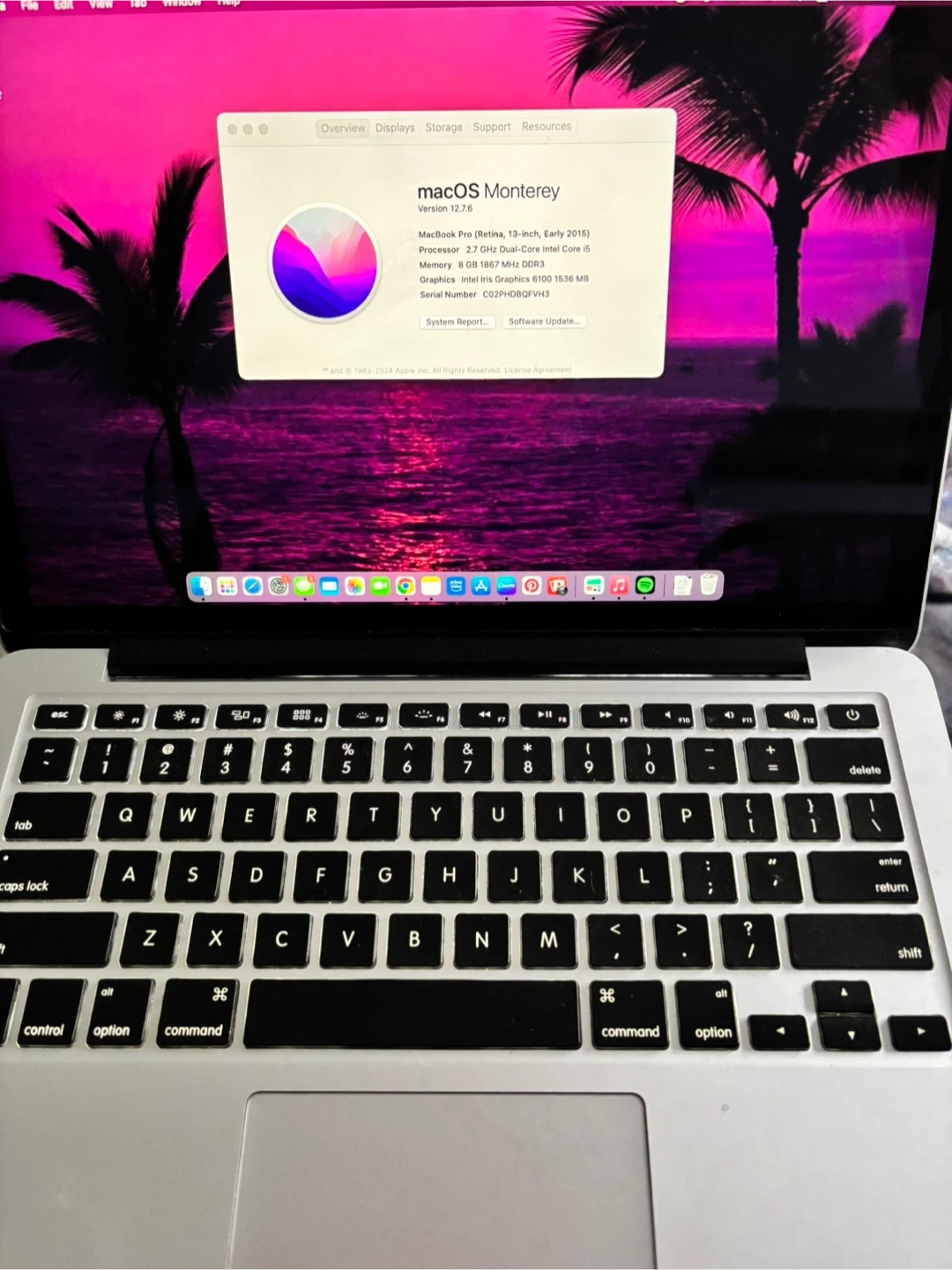 Selling a MacBook Pro (Retina, 13-inch, Early 2015) in good condition! It features macOS Monterey version 12.7.6, a 2.7 GHz Dual-Core Intel Core i5 processor, 8 GB of 1867 MHz DDR3 memory, and Intel Iris Graphics 6100 1536 MB graphics. Serial Number is C02PHDBQFVH3