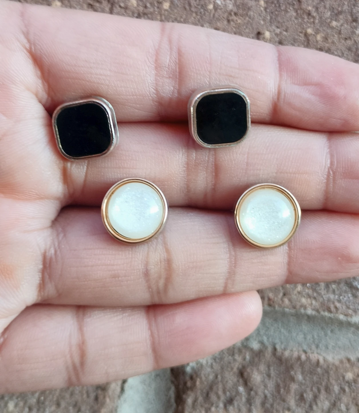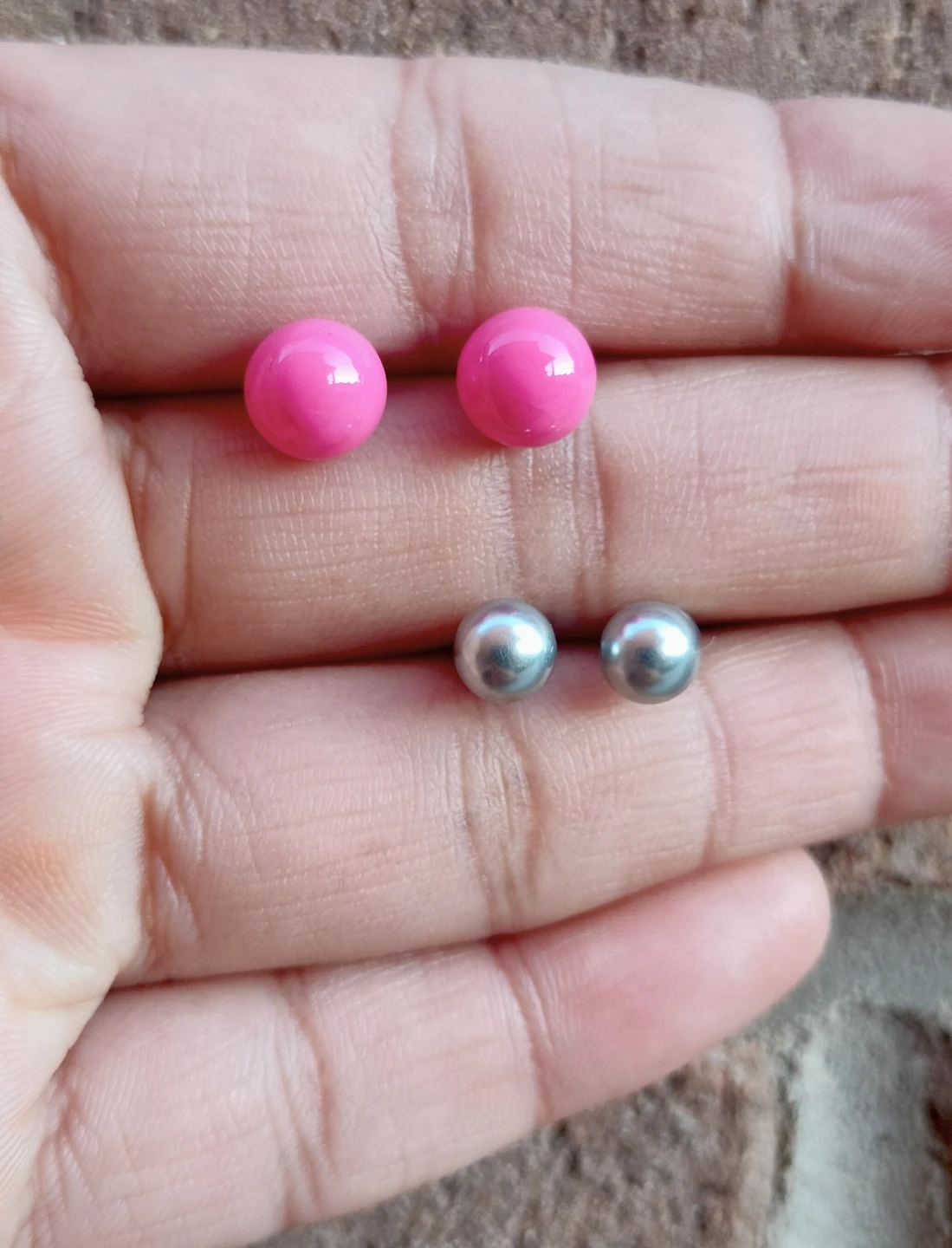 Selling a collection of cute stud earrings! There are six pairs: a pair with a lock design, a pair with a heart design, a pair of pink studs, a pair of silver studs, a pair of black square studs, and a pair of pearl studs.