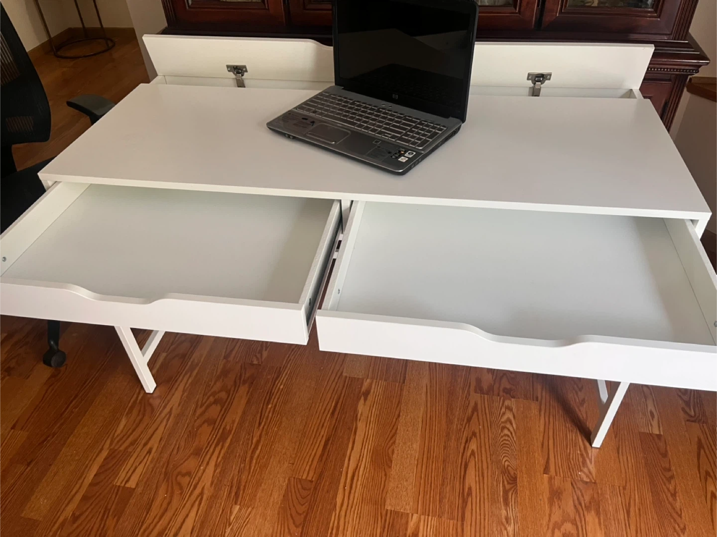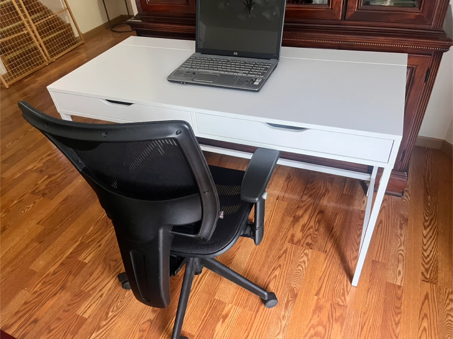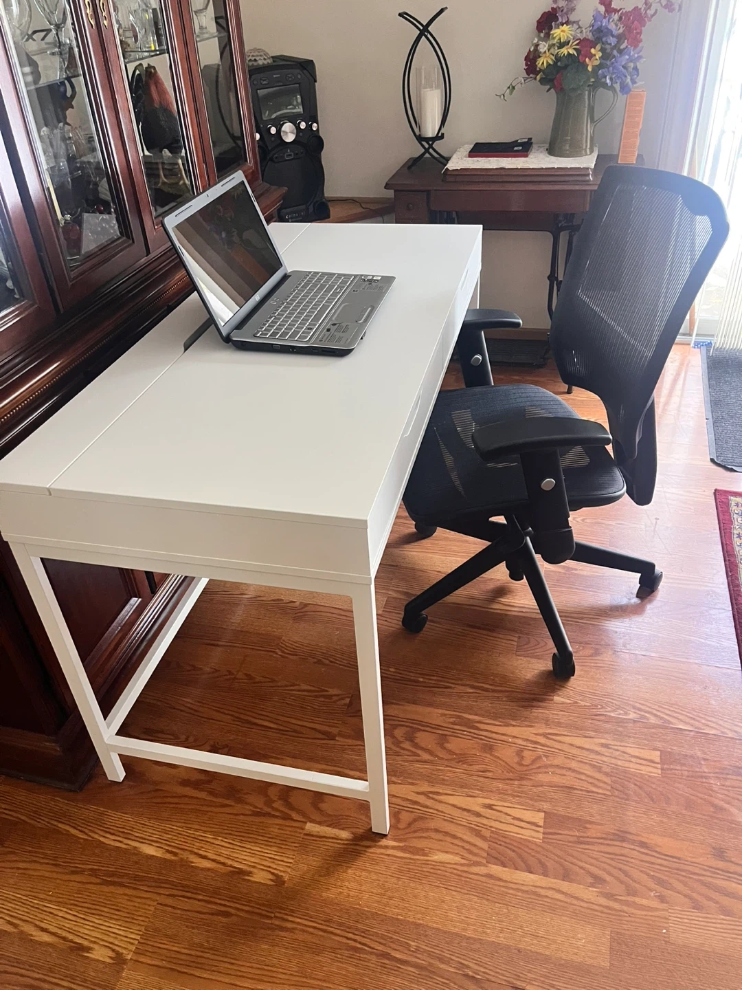 Selling a white desk and black office chair. The desk has a few minor blemishes on the surface, but is otherwise in good condition. The chair is in great shape and very comfortable. Perfect for a home office setup!