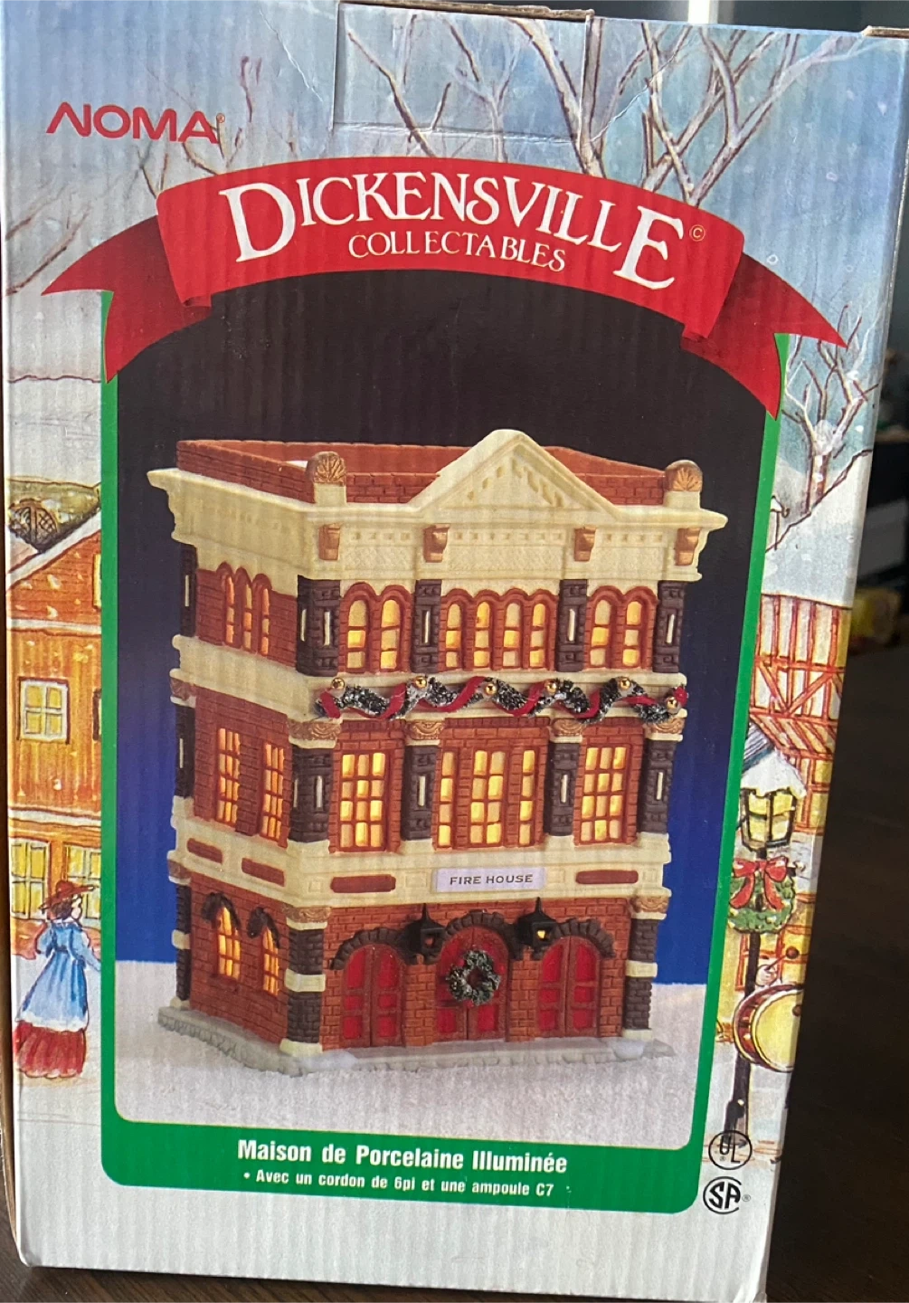 Selling a NOMA Dickensville Collectables Fire House. It's a porcelain lighted house with a cord and C7 bulb, and an on/off switch. Comes in its original box!
