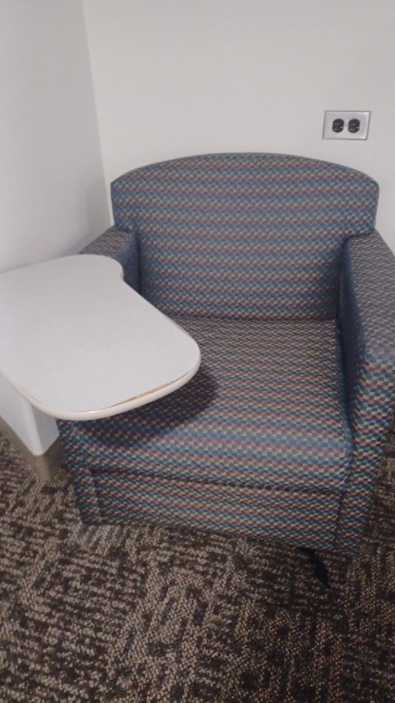 This is a used armchair that comes with an attached table. It features a patterned fabric and is perfect for a study room or waiting area