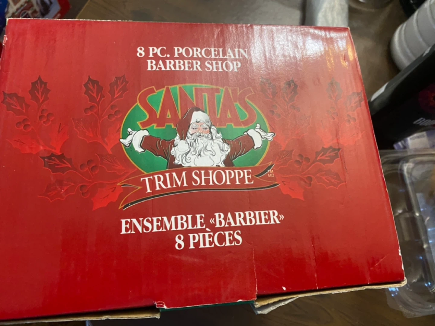 Selling a Santa's Trim Shoppe 8-piece porcelain barber shop set! It includes: