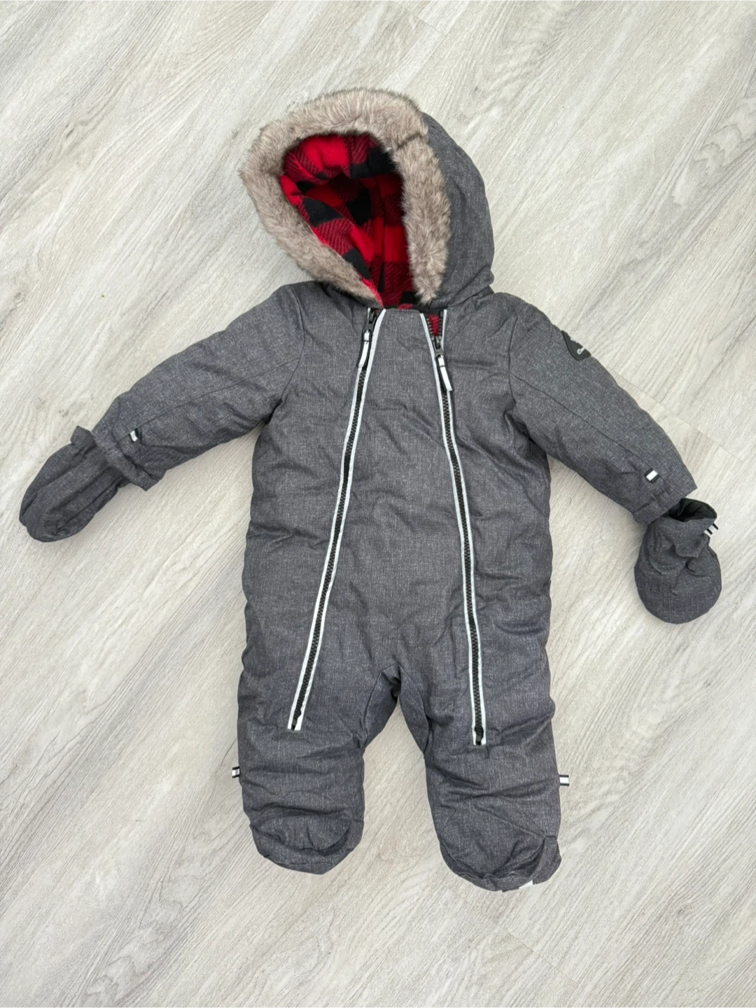 Keep your little one warm this winter with this adorable Canadiana snowsuit. It features a cozy red plaid lining and a stylish grey exterior. The attached mittens will keep tiny hands snug and warm on chilly days