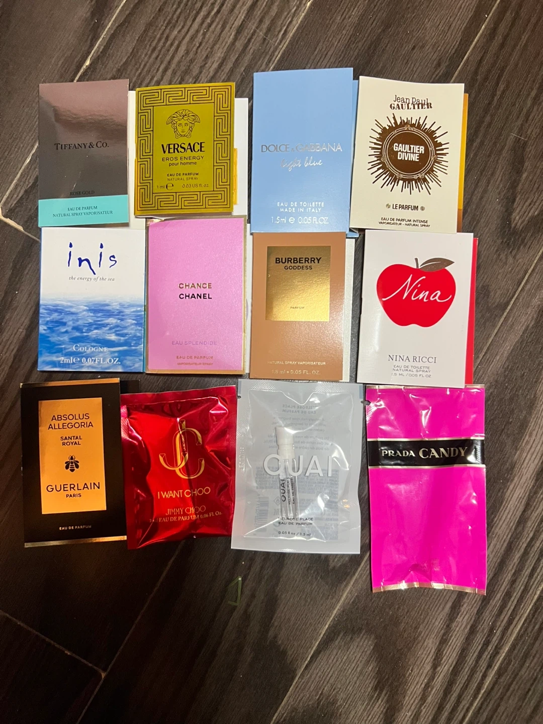 Selling a collection of perfume sample vials. Includes brands like Versace, Dolce & Gabbana, Burberry, Nina Ricci, Prada, Guerlain, Jimmy Choo, Tiffany & Co, Inis, Jean Paul Gaultier, Chance Chanel, and Ouai! Perfect for trying out new scents before committing to a full bottle