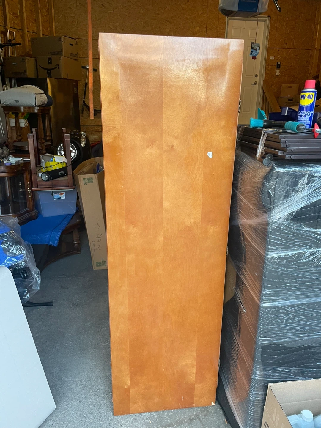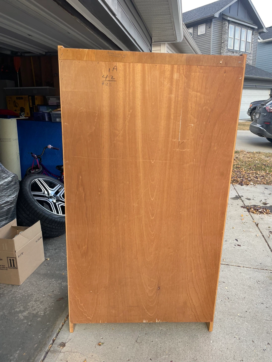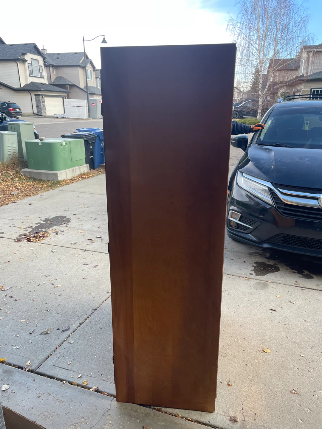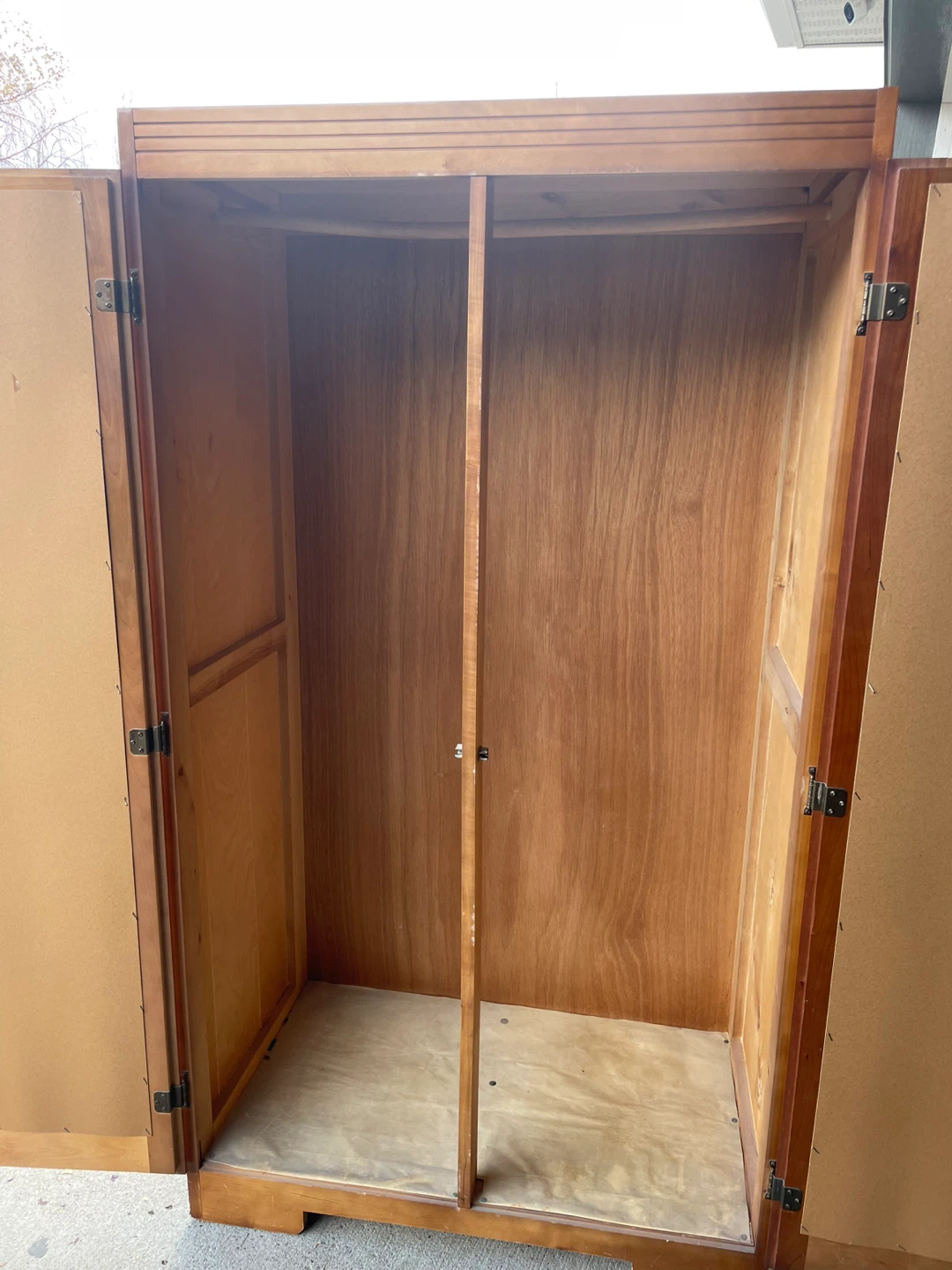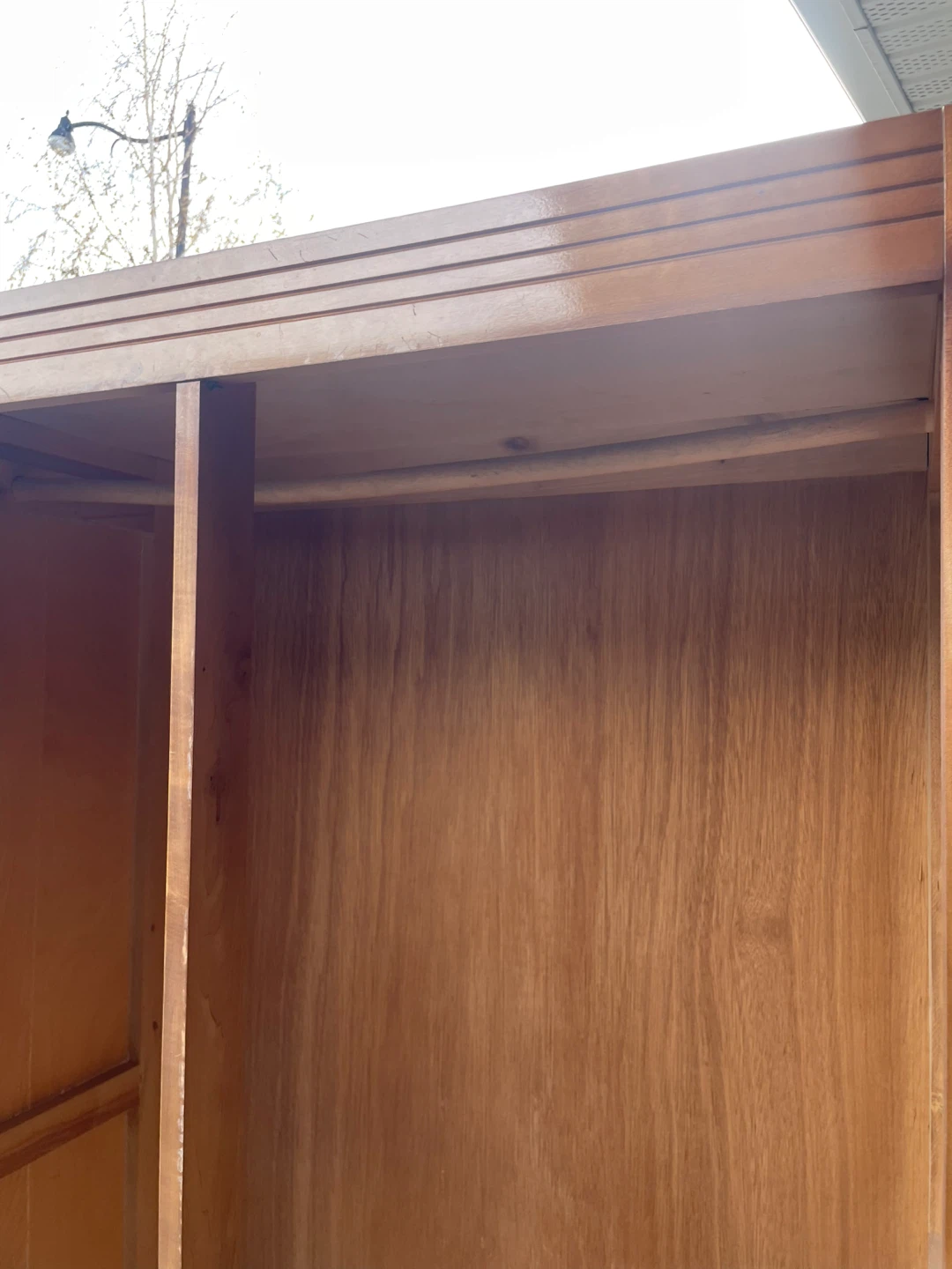 Here's a wooden wardrobe with mirrored doors! It's perfect for adding extra storage to your bedroom or hallway. It features a classic design and is in good condition. The interior is spacious, with a hanging rod and shelving for organizing your clothes and accessories