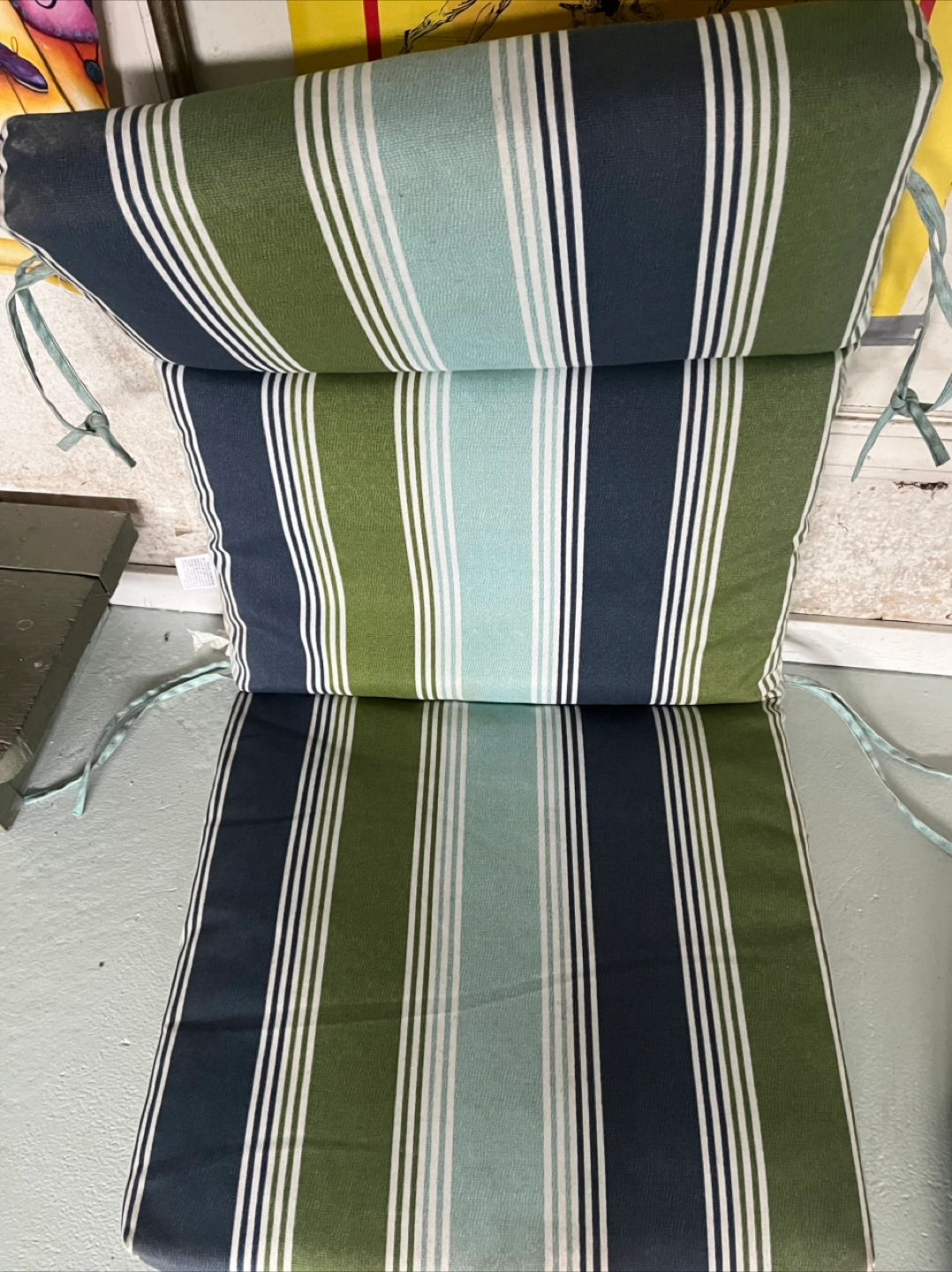 Here's a comfy outdoor chair cushion with a striped pattern! It features a mix of green, blue, and white stripes and has ties to secure it to your chair. Perfect for adding a bit of style and comfort to your outdoor seating