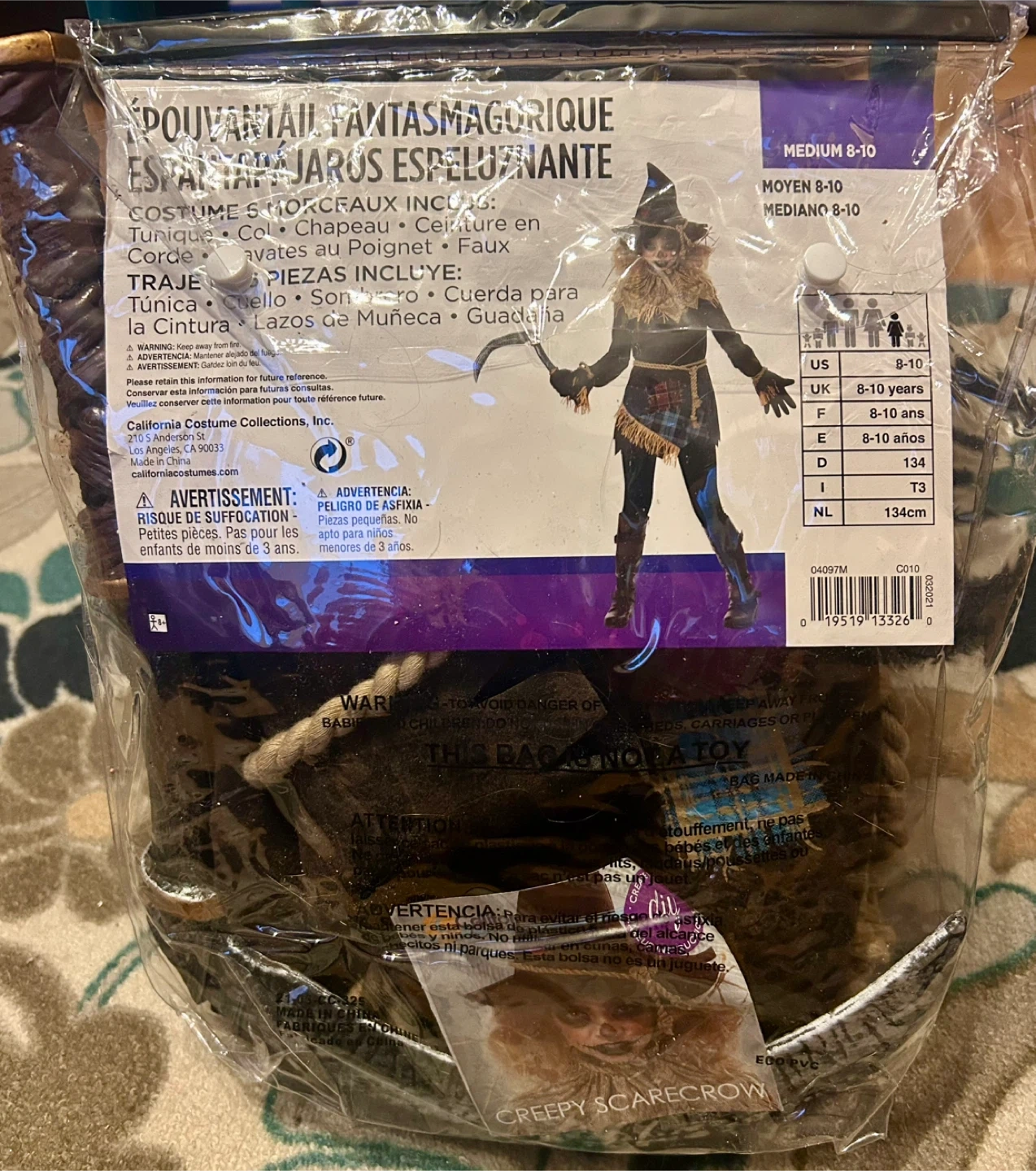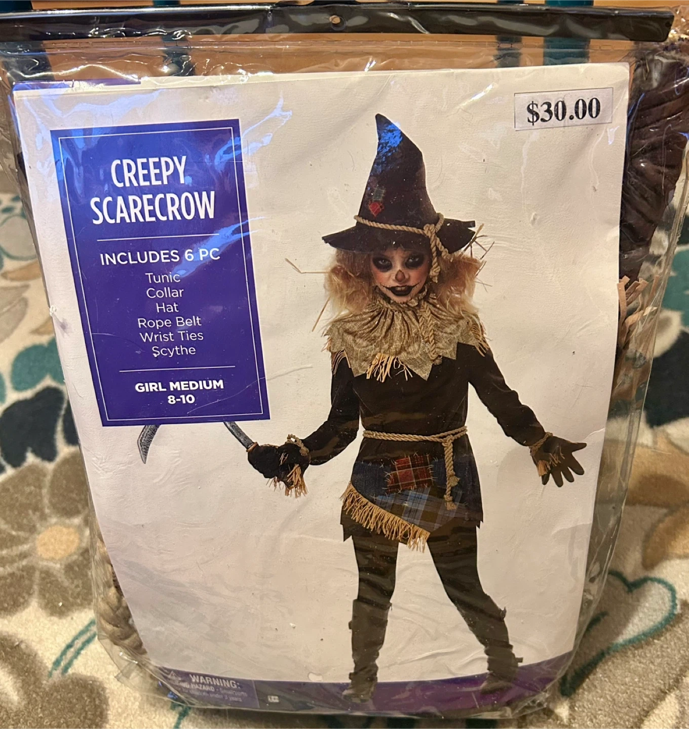 Transform your child into a spooky scarecrow with this Creepy Scarecrow Kids Costume. Featuring a black tunic and hat with brown accents, this costume is perfect for Halloween or dress-up fun. Includes a collar, tunic, hat, rope belt, wrist ties, and scythe for a complete look. Size Girl-Medium 8-10. Great condition, worn once.