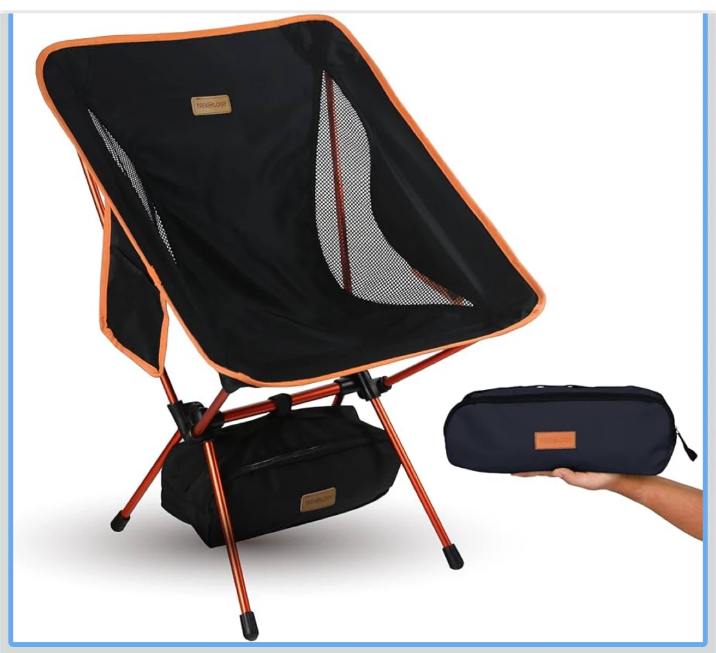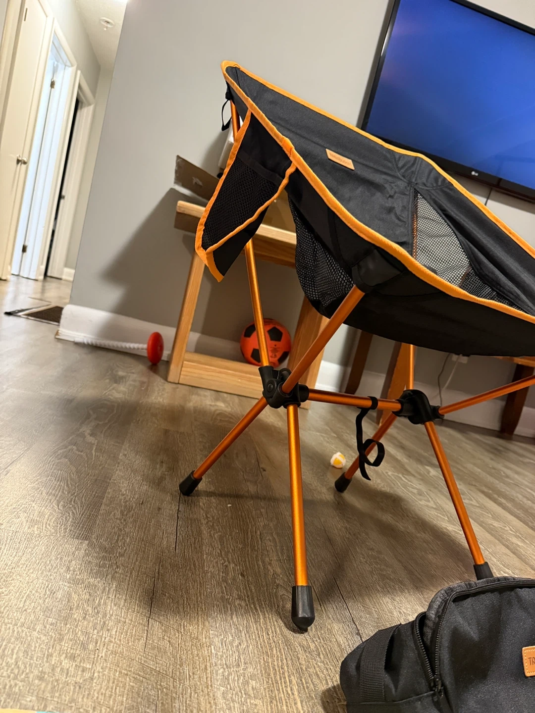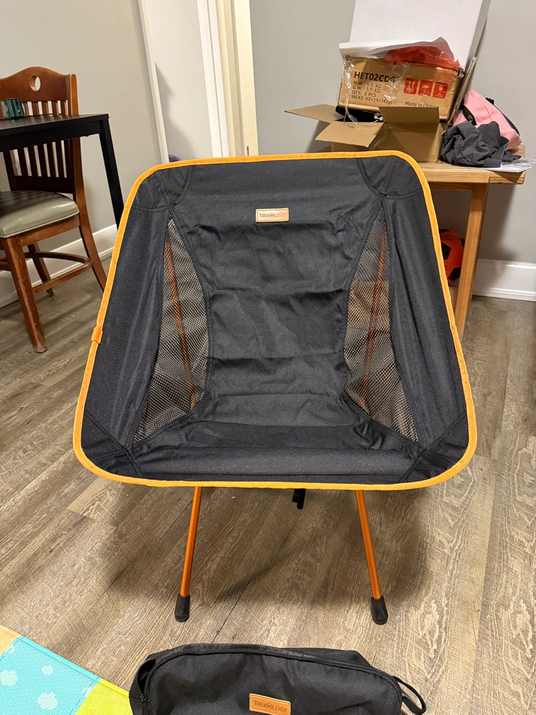This Trekology YIZI GO portable camping chair is perfect for outdoor adventures! It features a black fabric with orange accents and comes with its original carrying bag.