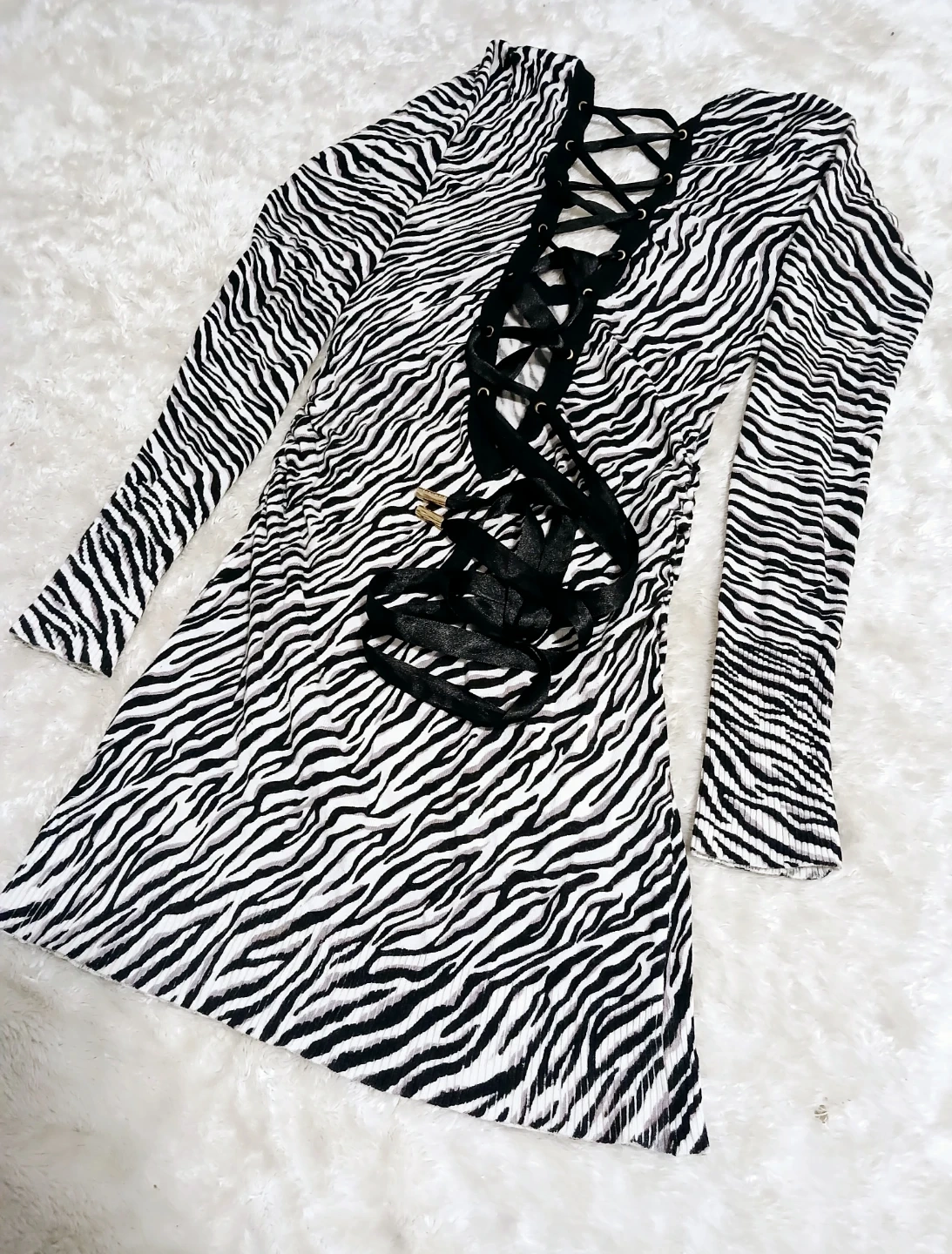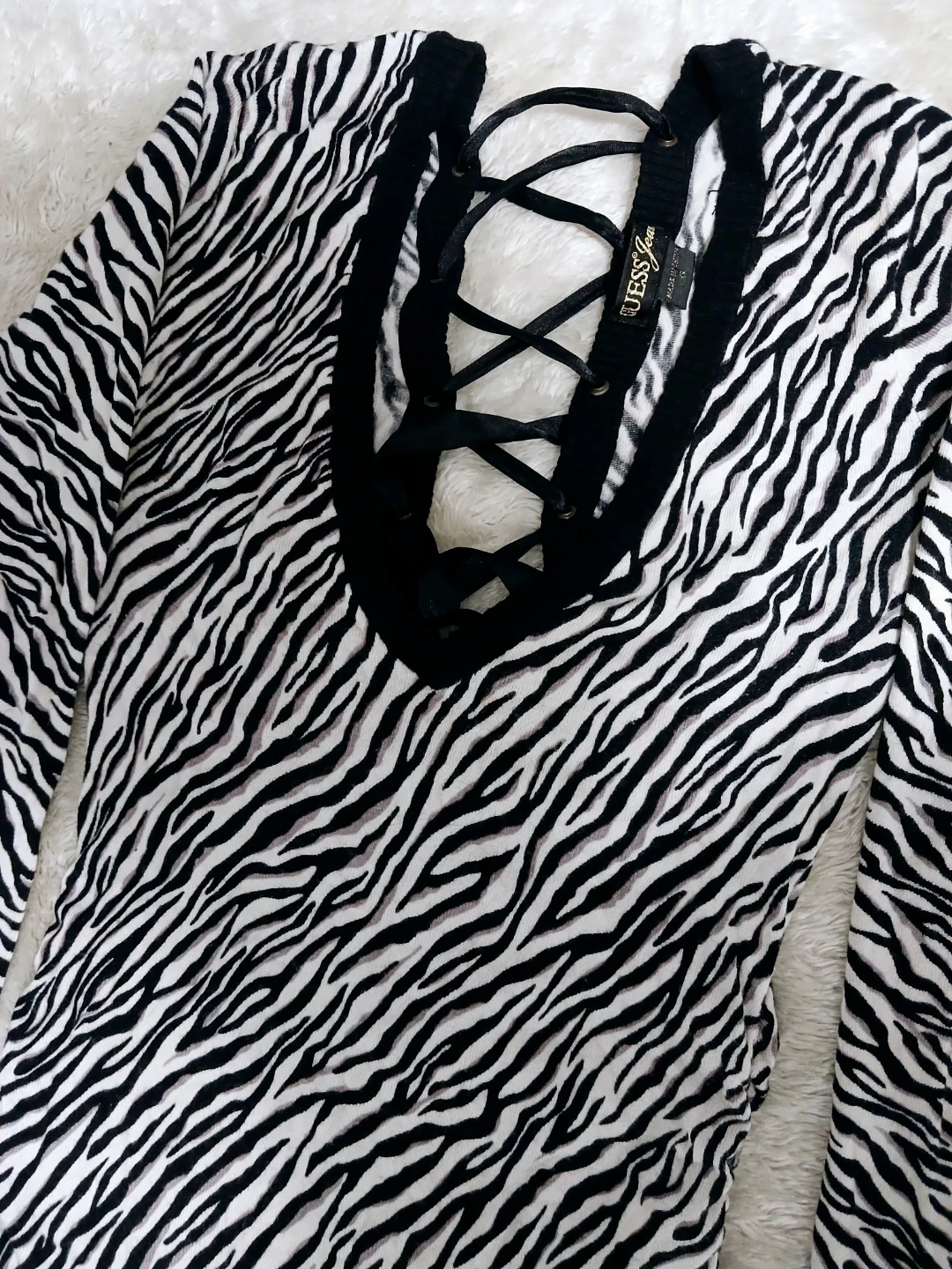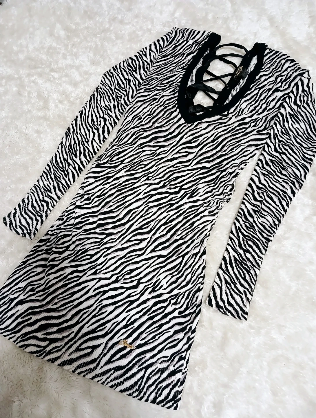 This Guess dress features a unique zebra print and a stylish lace-up back! It's perfect for adding a bold statement to your wardrobe. The long sleeves make it ideal for cooler weather. STRETCHABLE!