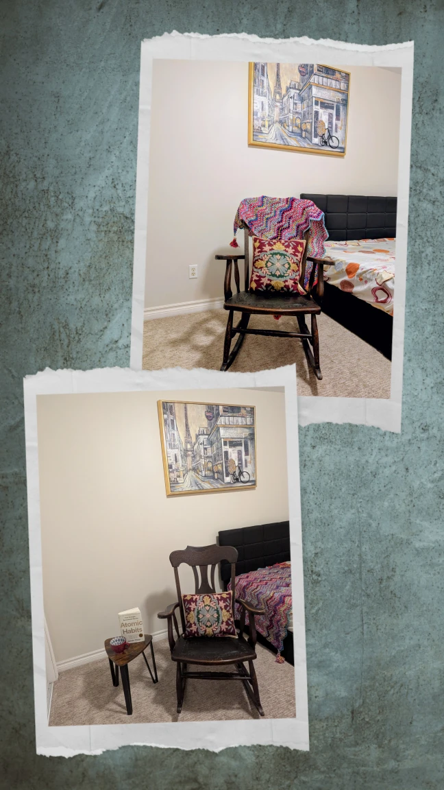 OBO Here's a more than 100 year old vintage rocking chair with a dark wood finish and a dark green leather seat. It has some wear and tear, as you can see in the photos, but it's still a sturdy and comfortable chair for relaxing. It would be a great addition to any living room or nursery!