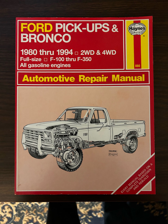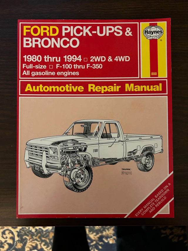 This is a Haynes automotive repair manual for Ford Pick-ups and Broncos from 1980 through 1994, covering 2WD and 4WD full-size F-100 thru F-350 models with all gasoline engines; this book is in acceptable condition with signs of wear and tear. Specifications: * Models: Ford Pick-ups & Bronco * Years: 1980-1994 * Coverage: 2WD & 4WD, Full-size F-100 thru F-350, All gasoline engines This manual is ready to jump into action, and if the ad is up, then it's still available! I estimate this manual to be worth $15.