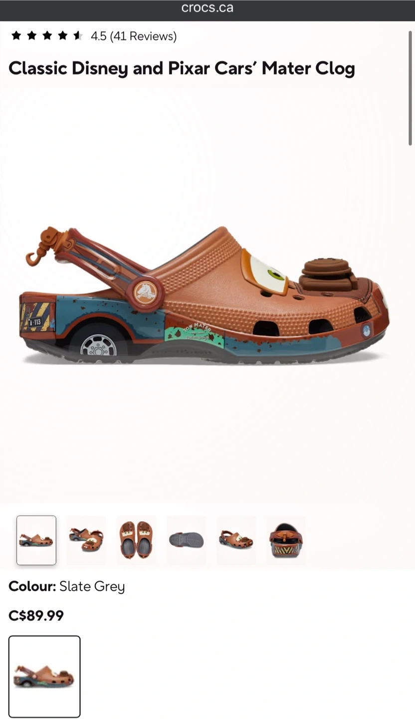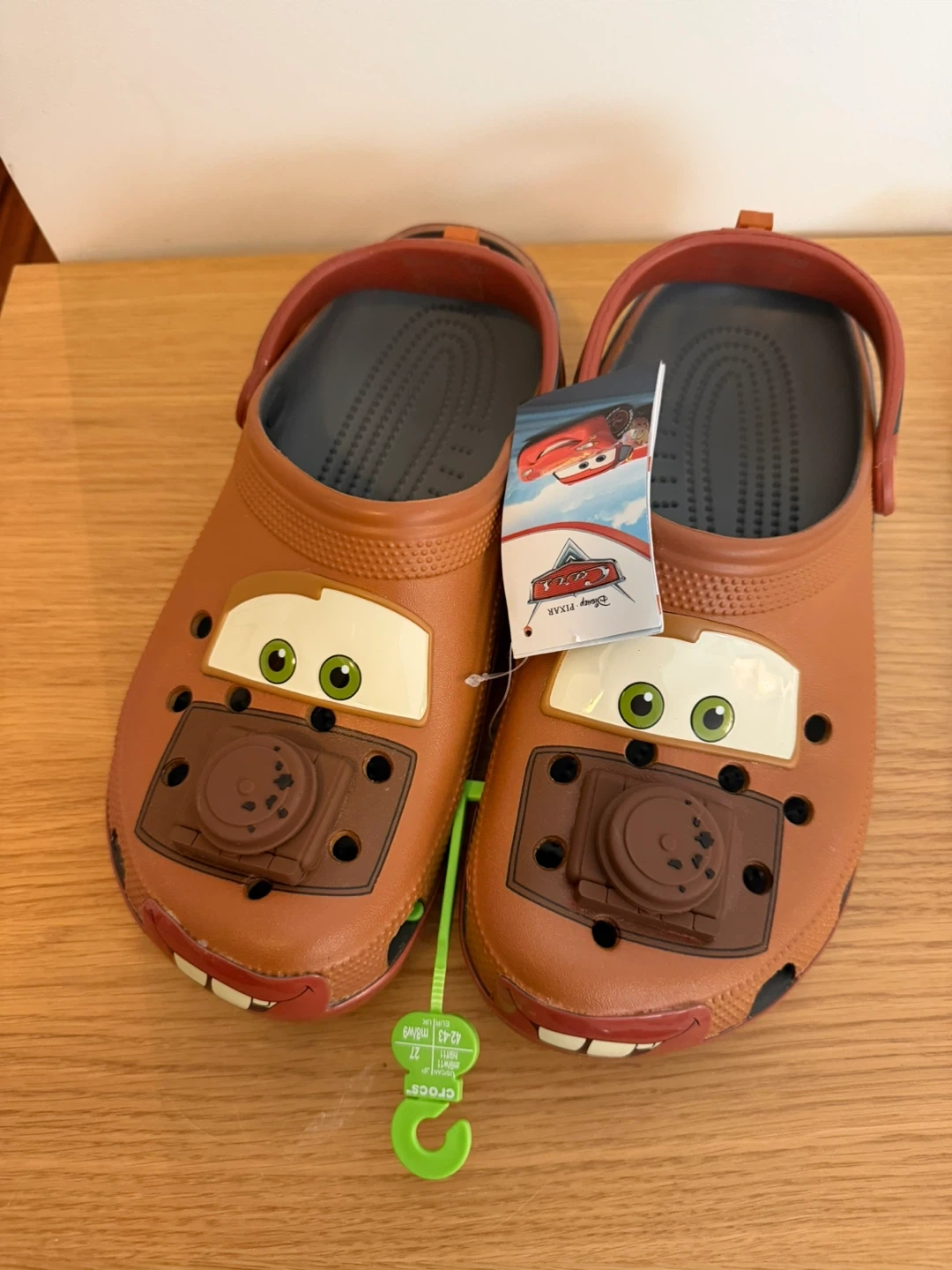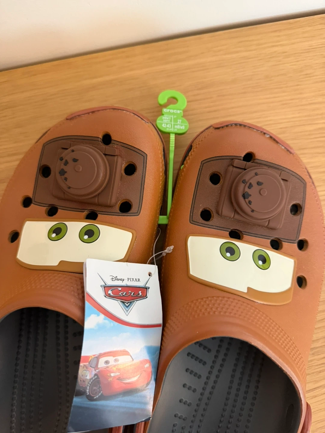 These are brand new Crocs featuring Disney Pixar's Mater from Cars! They're a size 9 for men and 11 for women. Super cute and comfy!