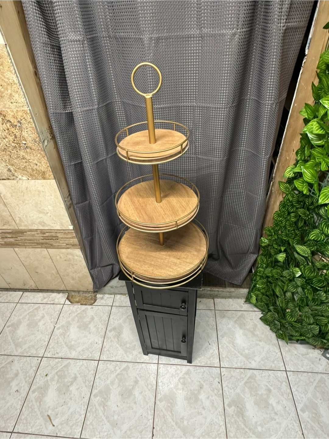 This unique piece combines functionality with style, perfect for displaying treats or decor. The stand features wooden tiers with a gold-tone frame, adding a touch of elegance to any room. It's in great condition and ready to find a new home!