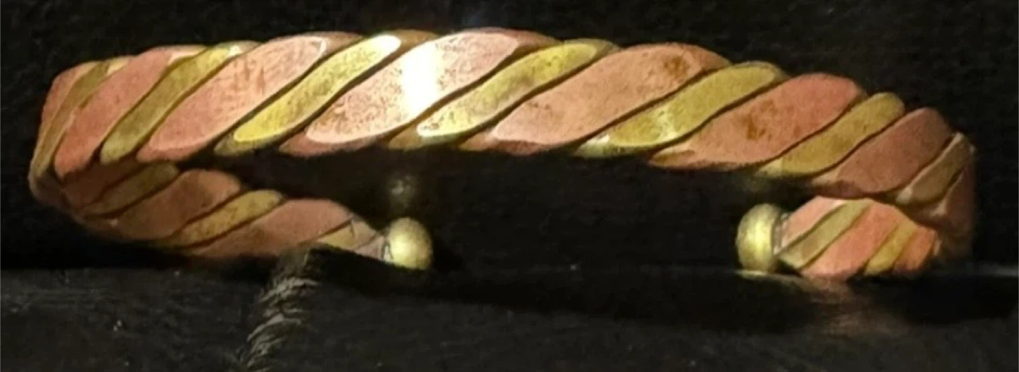 This is a unique handcrafted bangle bracelet. It features a twisted design with copper and brass tones. The open cuff style makes it easy to wear!
