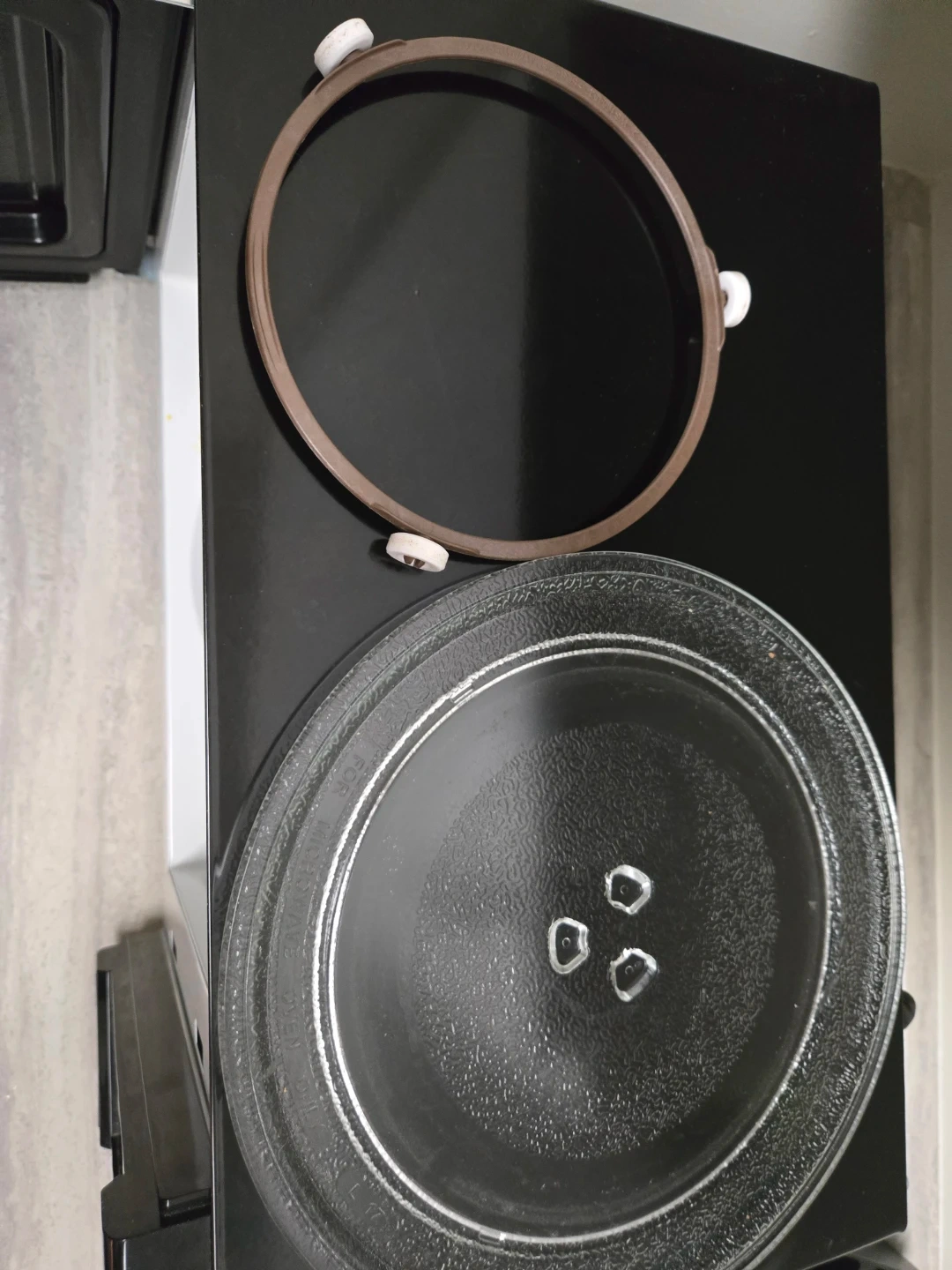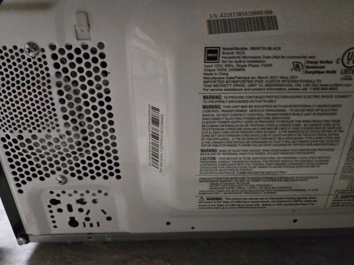 Selling a used RCA microwave oven, model RMW733-BLACK. It's a household microwave oven, not for commercial use. The input is 120V, 60Hz, single phase, 1100W, with an output of 700W at 2450MHz. Includes the glass turntable and rotating ring.