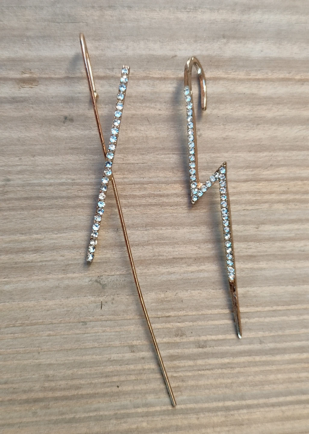 Cute gold-tone lightning bolt crawler ear cuffs with clear stones. They are great, elegant and ready to add some sparkle to your look!