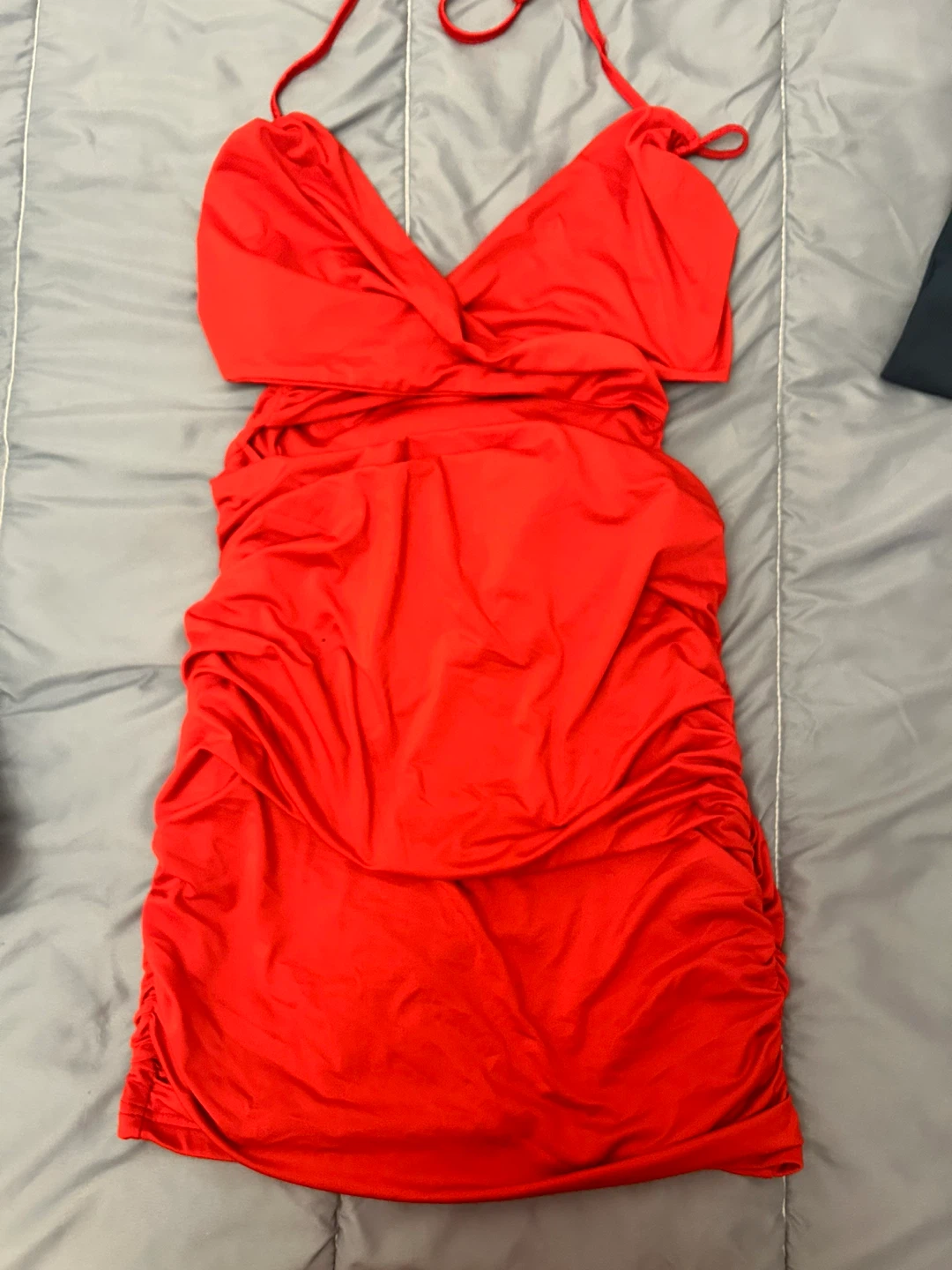 Selling a cute red mini dress! It's in great condition and ready for a new home. The dress has a halter-style neckline and a flattering, form-fitting silhouette. Perfect for a night out or a special occasion!