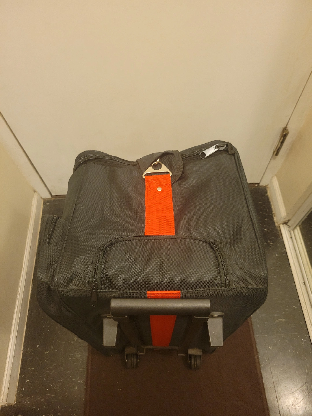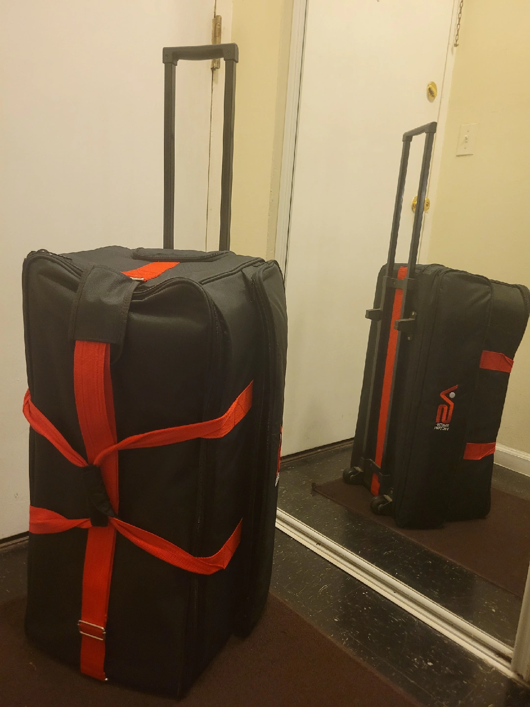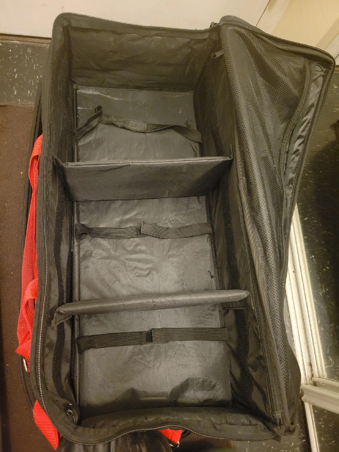 Smith Victor Bag. Great case for transporting photography lighting gear but can use for multiple things. Extendable handle, wheels, space to easily access light stands. Dividers for gear and top divider to help protect gear.