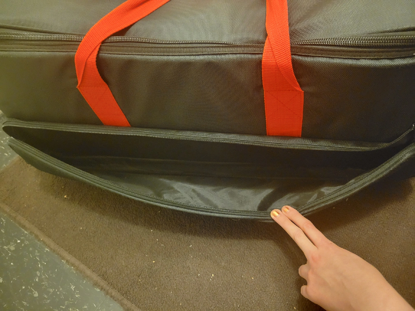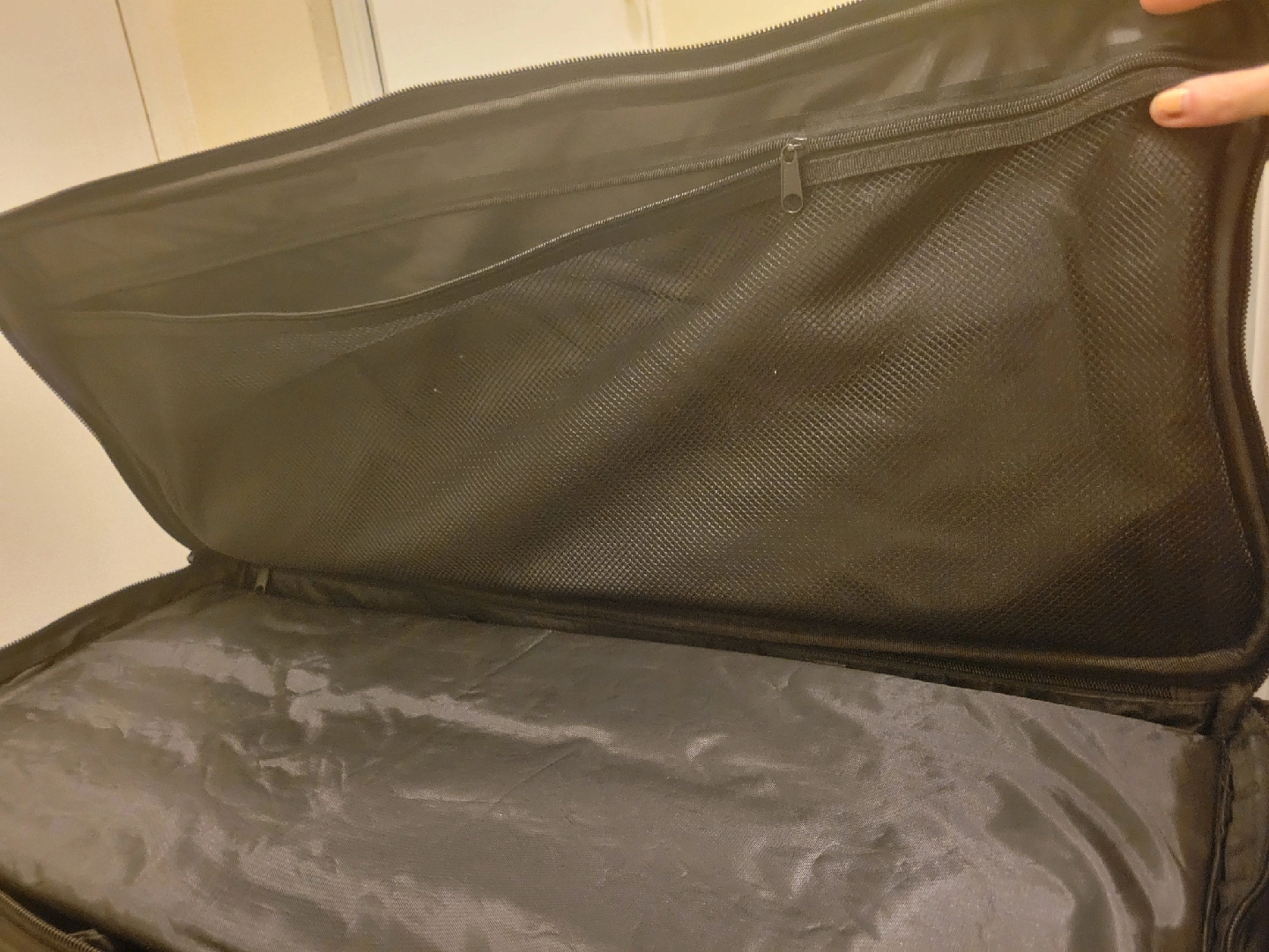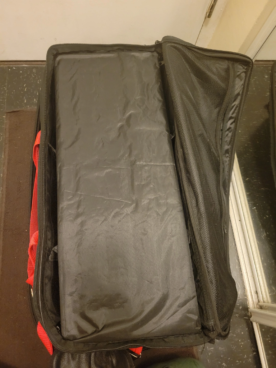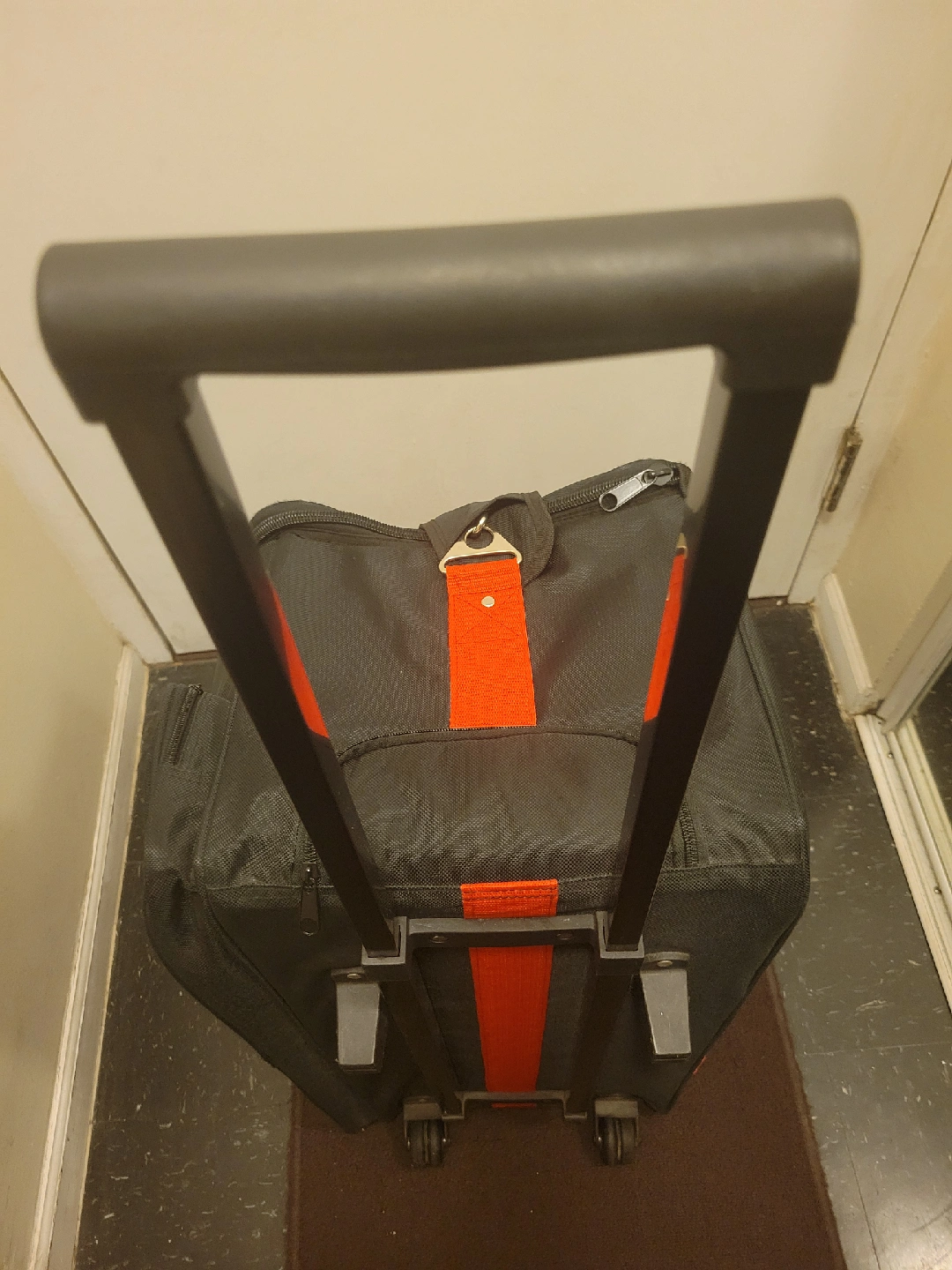 Smith Victor Bag. Great case for transporting photography lighting gear but can use for multiple things. Extendable handle, wheels, space to easily access light stands. Dividers for gear and top divider to help protect gear.