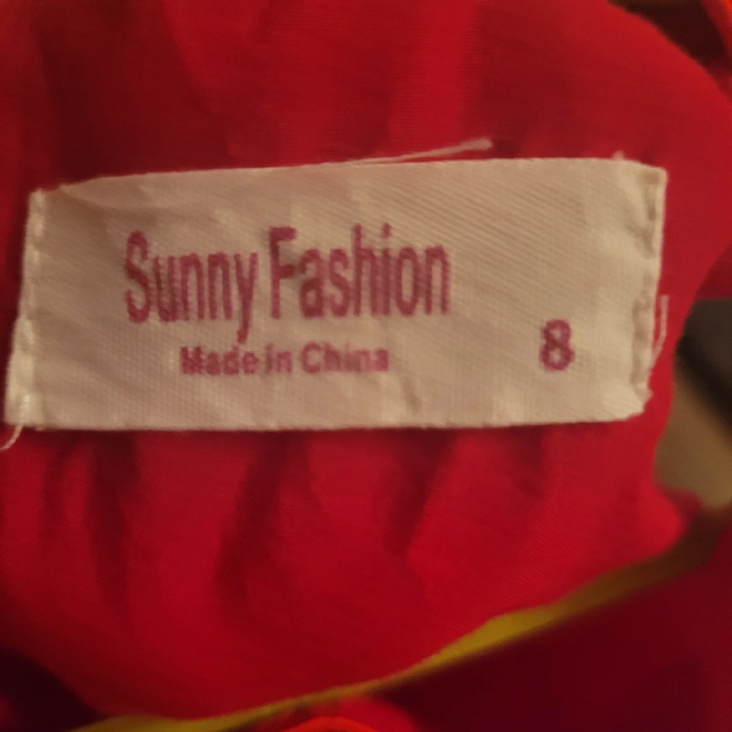 A beautiful red dress from Sunny Fashion, size 8 girls. It has a lovely design with a layered skirt and a decorative belt.