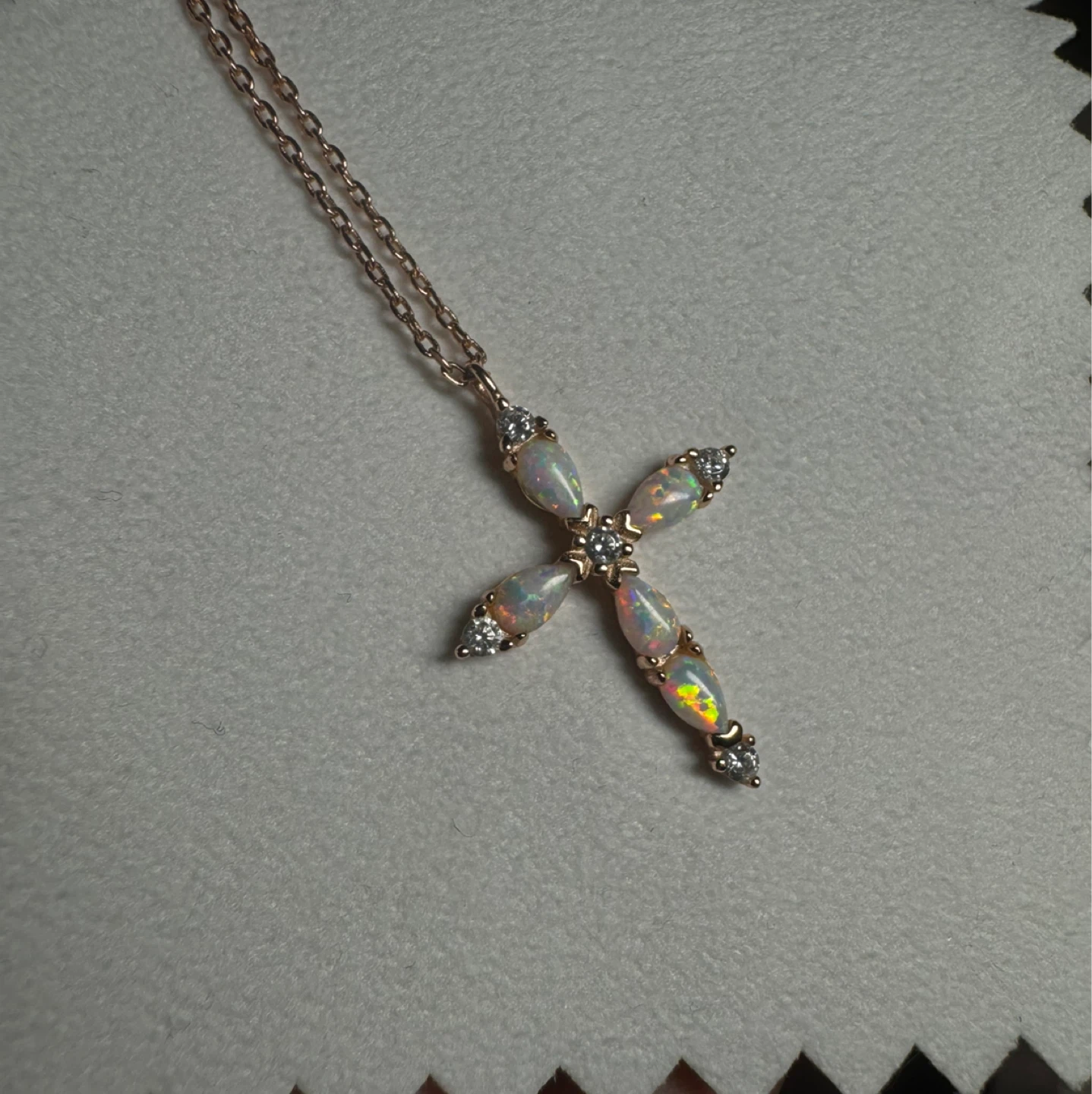 This is a beautiful rose gold cross pendant necklace. It's in excellent condition and ready to wear! The clasp is marked with '925', indicating the metal is sterling silver with rose gold plating.