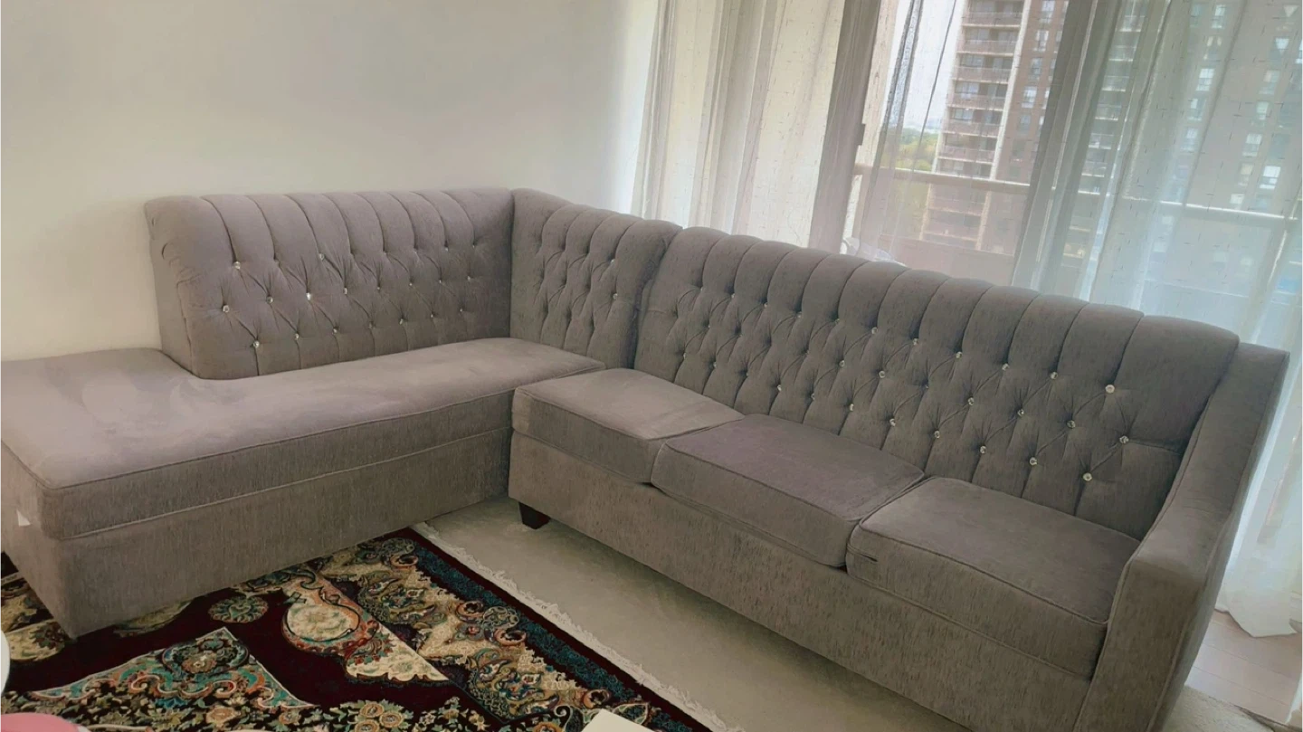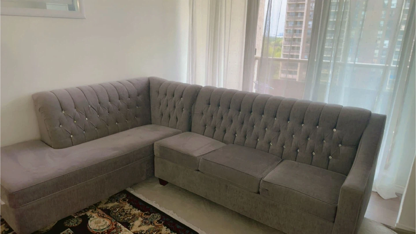 Selling a grey sectional sofa. It's in great shape and would be perfect for a living room or den. The material is soft and comfortable, and the neutral colour will match any decor.