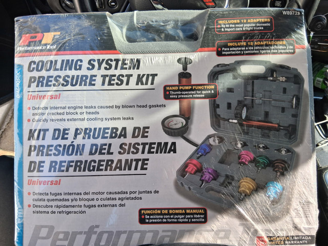 This Performance Tool W89733 cooling system pressure test kit is in new condition and includes 12 adapters to fit most domestic and import cars and light trucks. It's designed to detect internal engine leaks caused by blown head gaskets and quickly reveals external cooling system leaks.